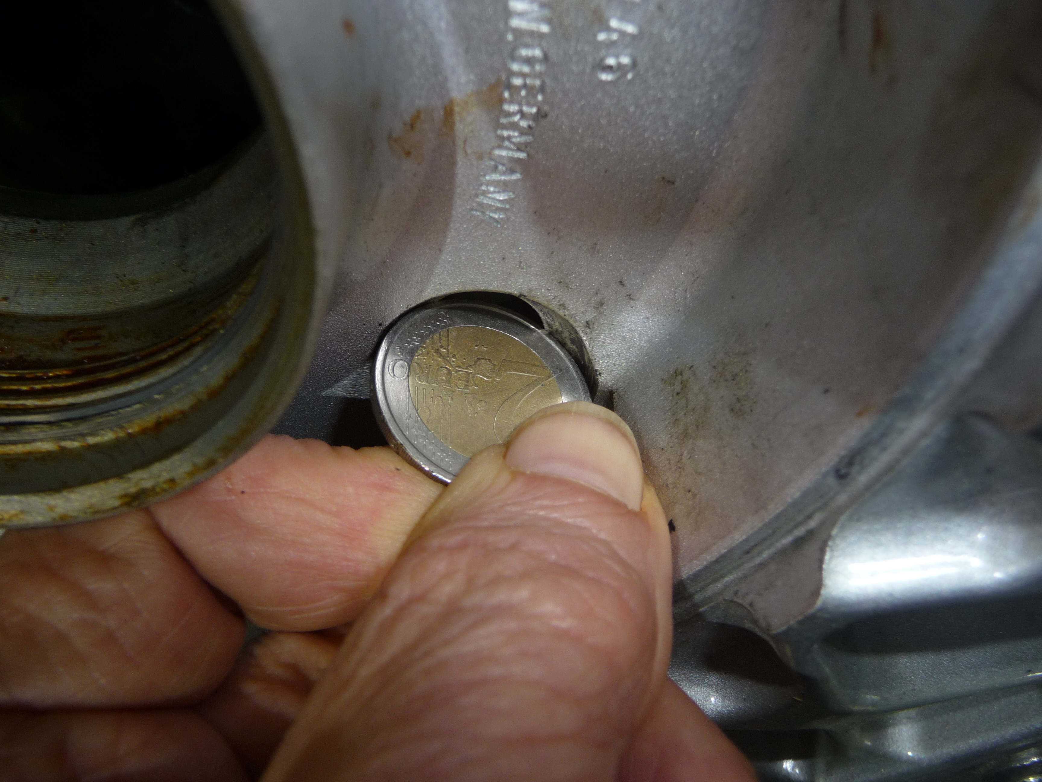 Vu de l'arrière, on reconnaît les extrémités des goujons affleurant au-delà du plan de joint sur le disque de freinage: