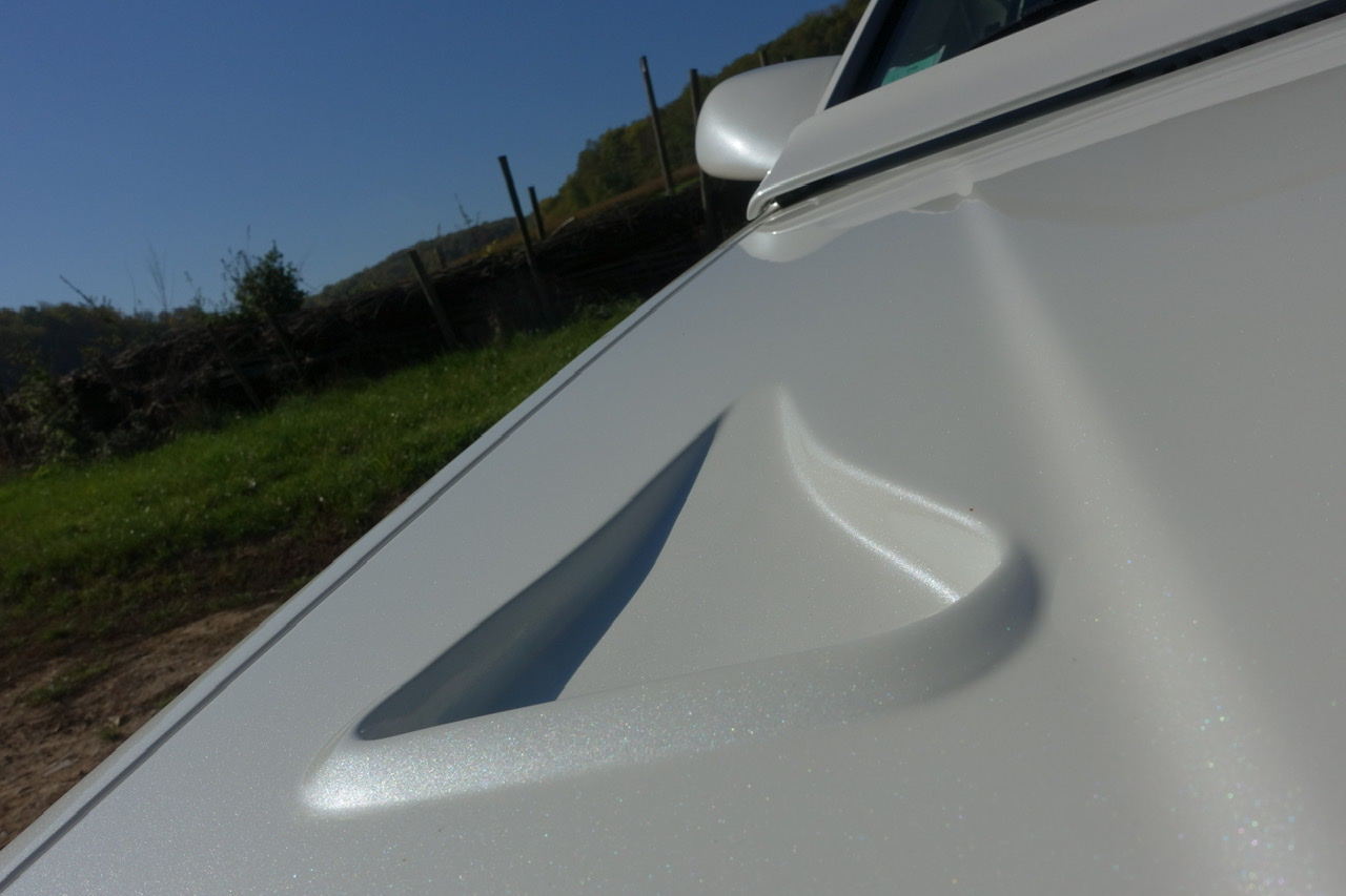 Sur ce véhicule, en plus, des louvres positionnées plus en AV sur le capot auraient favorisé un effet d'appui au sol du train AV, bien utile sur ce véhicule à nez pointu bien connu pour l'allègement de l'AV à haute vitesse.