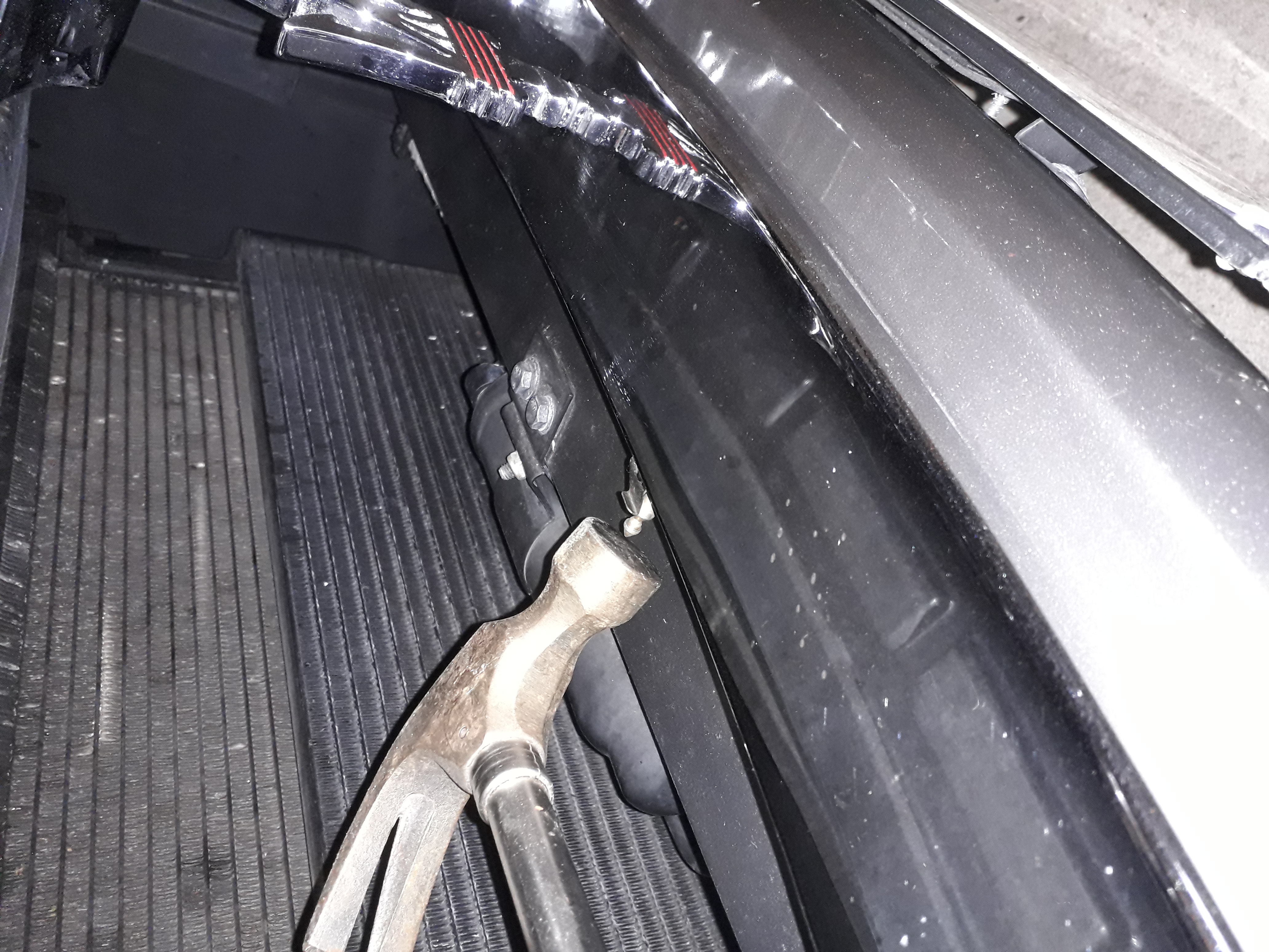 Après avec un petit marteau passer sous le pare-choc et venir taper sur les 4 pointes couleur or qui sont tenus entre deux lamelles métallique de couleur noir qui sont à l'horizontale direction moteur. J'espère pour vous que vous n'avez pas des mains de charpentier car ça va être compliqué car il y a très peu de place .