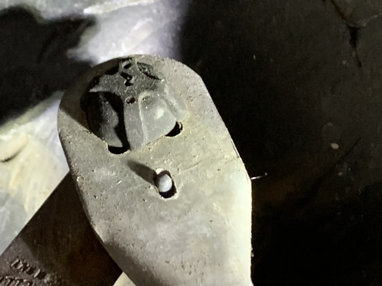 Sorti cette fameuse rotule et fais deux petites entailles avec un forêt de 2mm sur le dessous. Le but est de mettre deux fils a freiner (fil inox) pour empêcher la rotation de cette rotule par rapport au bras et qu'elle sorte.