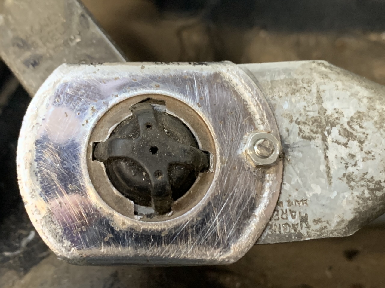Jusqu a ce que les rotules soient dispos..., j ai trouvé une espèce de rondelle dans le fourbis, usinée et ajustée a peu près pour faire une bride.