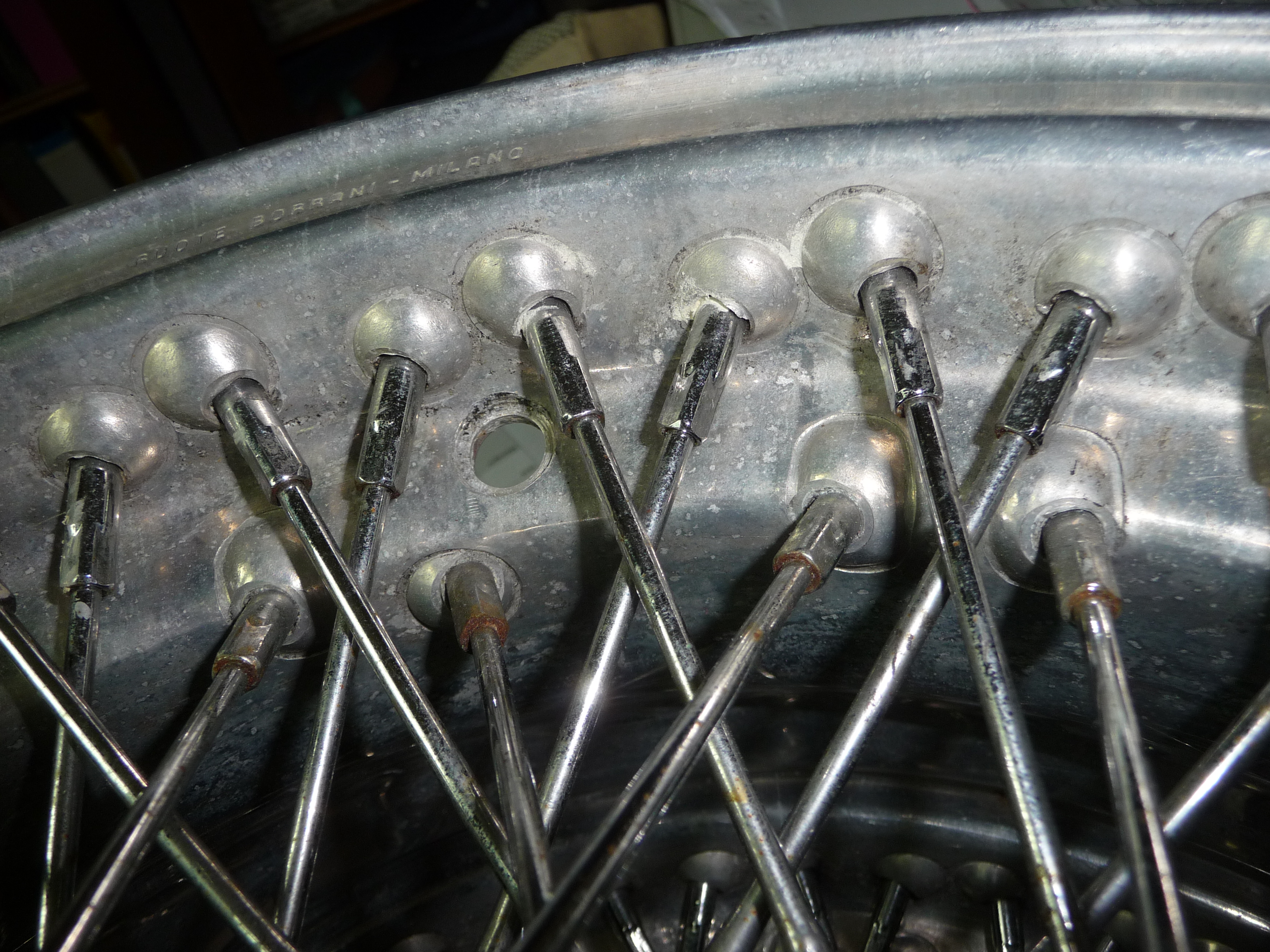 Il faut noter que, à la différence d'autres fabricants "industriels" de roues fil qui proposent l'utilisation aujourd'hui de rayons en inox pour s'affranchir des problèmes de corrosion, Borrani a toujours refusé d'utiliser l'inox, car ce métal a le gros inconvénient de subir un durcissement structural sous contrainte, ce qui peut le rendre cassant après utilisation dans des roues subissant des charges importantes en virage.
