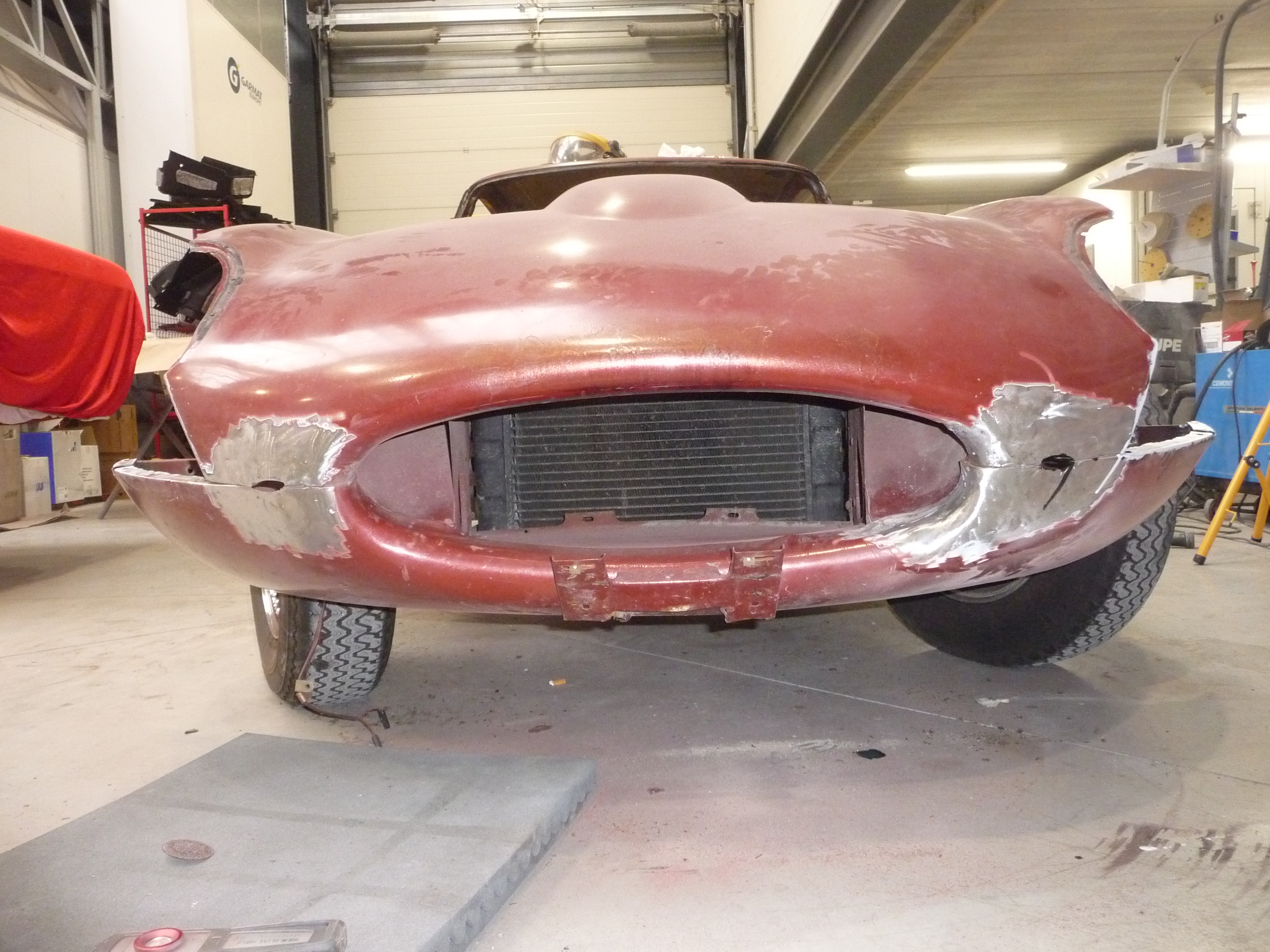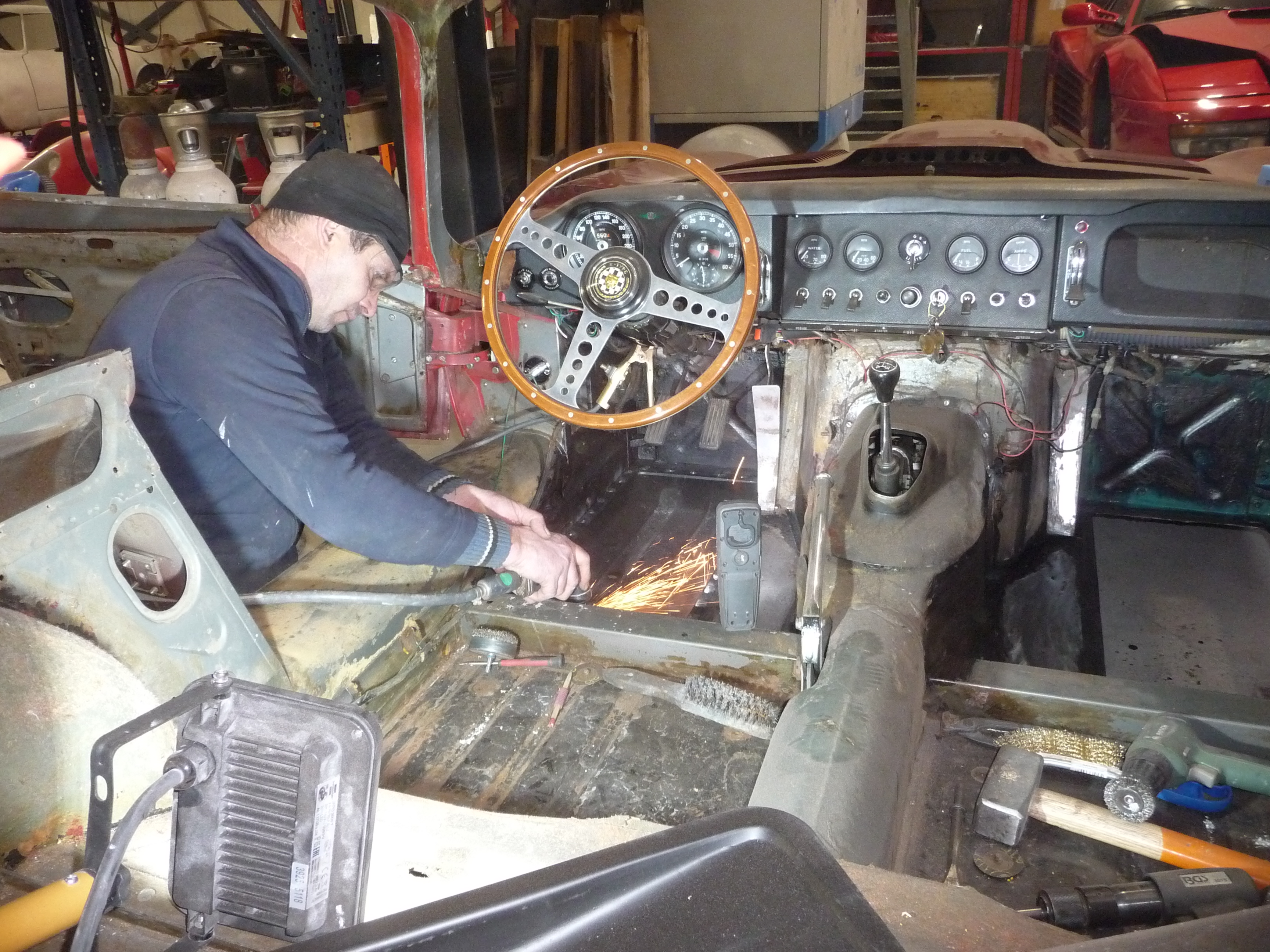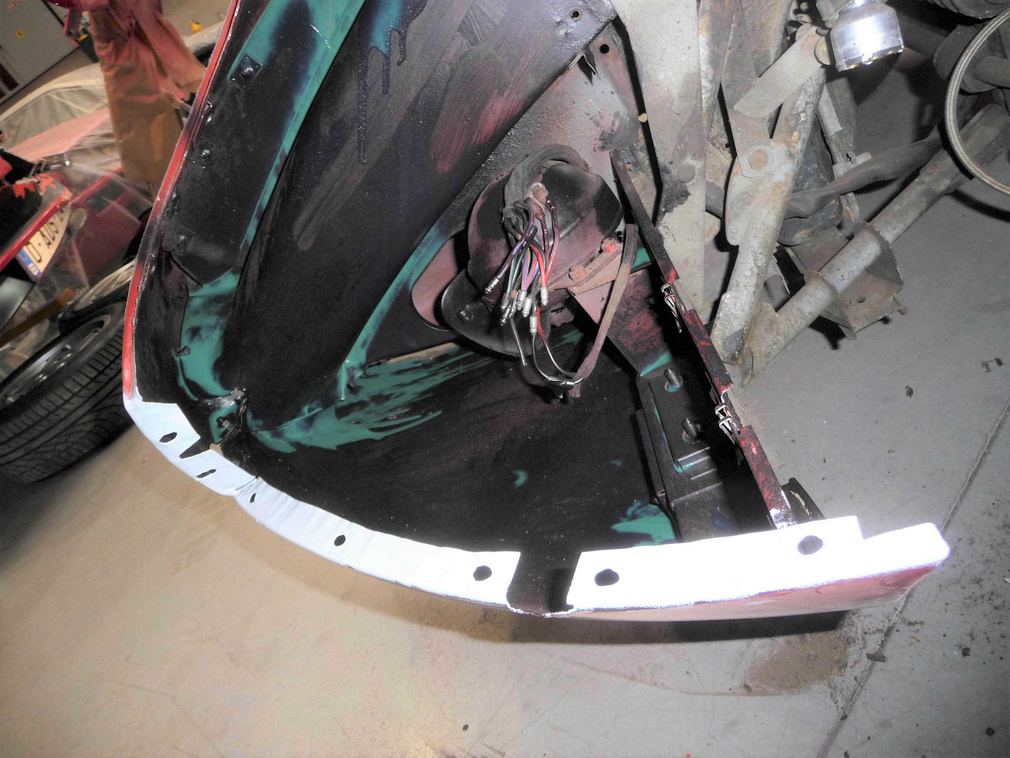 On voit aussi que le travail de nettoyage/ponçage des tôles a commencé, avec enduit de produits d'apprêt (ce qu'on voit au milieu, gris, c'est le sol de l'atelier au travers du plancher ;) ):