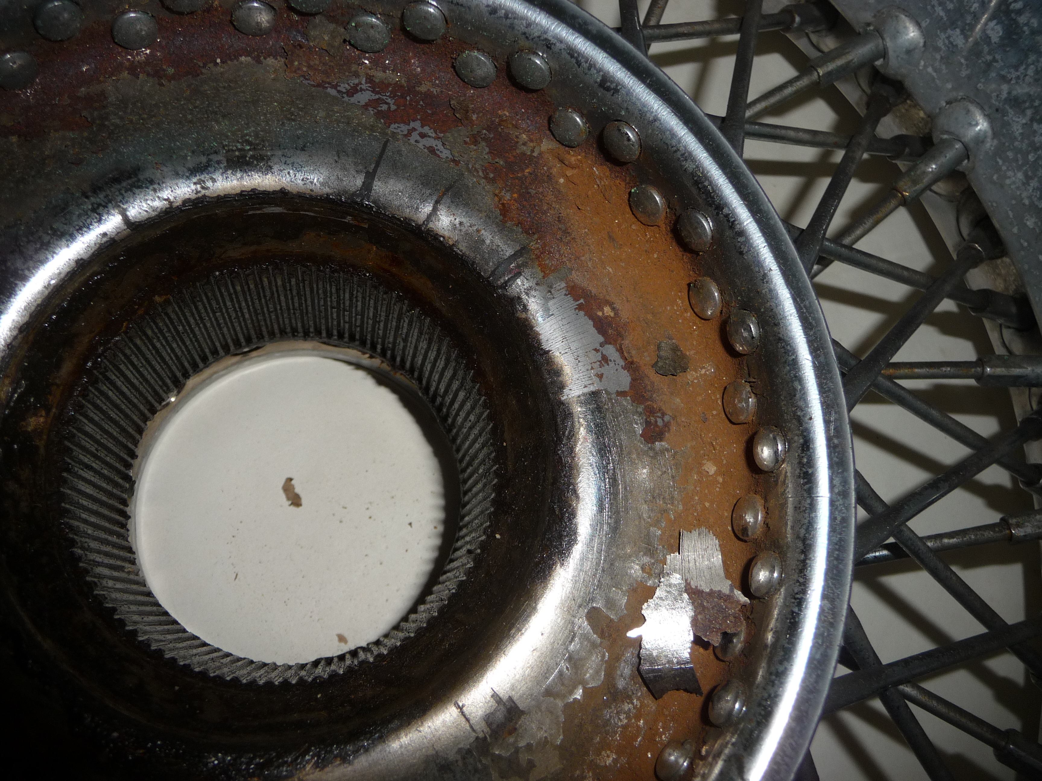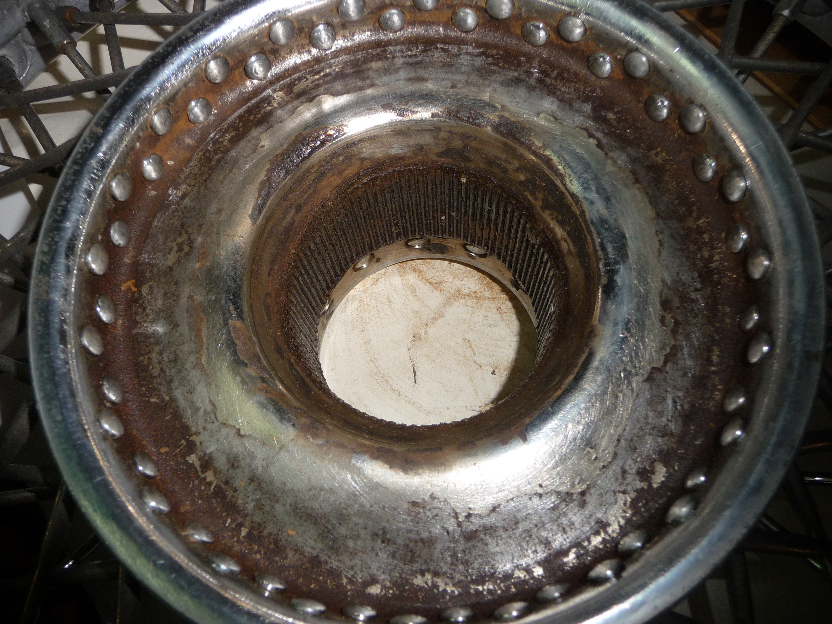 Comme je m'y attendais un peu, le ponçage mécanique de l'arrière du moyeu chromé d'une roue Borrani n'est pas facile.
