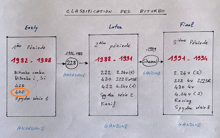 La famille des 420 (avec ses quatre modèles différents) appartient entièrement à la première génération des Biturbo, pourvue de la carrosserie originelle « Andreani » :