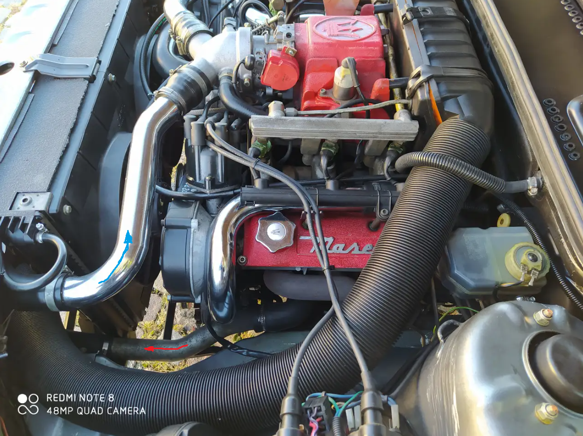 L’air comprimé par le turbo est assez chaud et se dirige vers l’avant vers le bas de l’intercooler (flèche rouge), puis l’air toujours comprimé mais refroidi par l’intercooler file vers le Y de la chambre d’admission (flèche bleue).