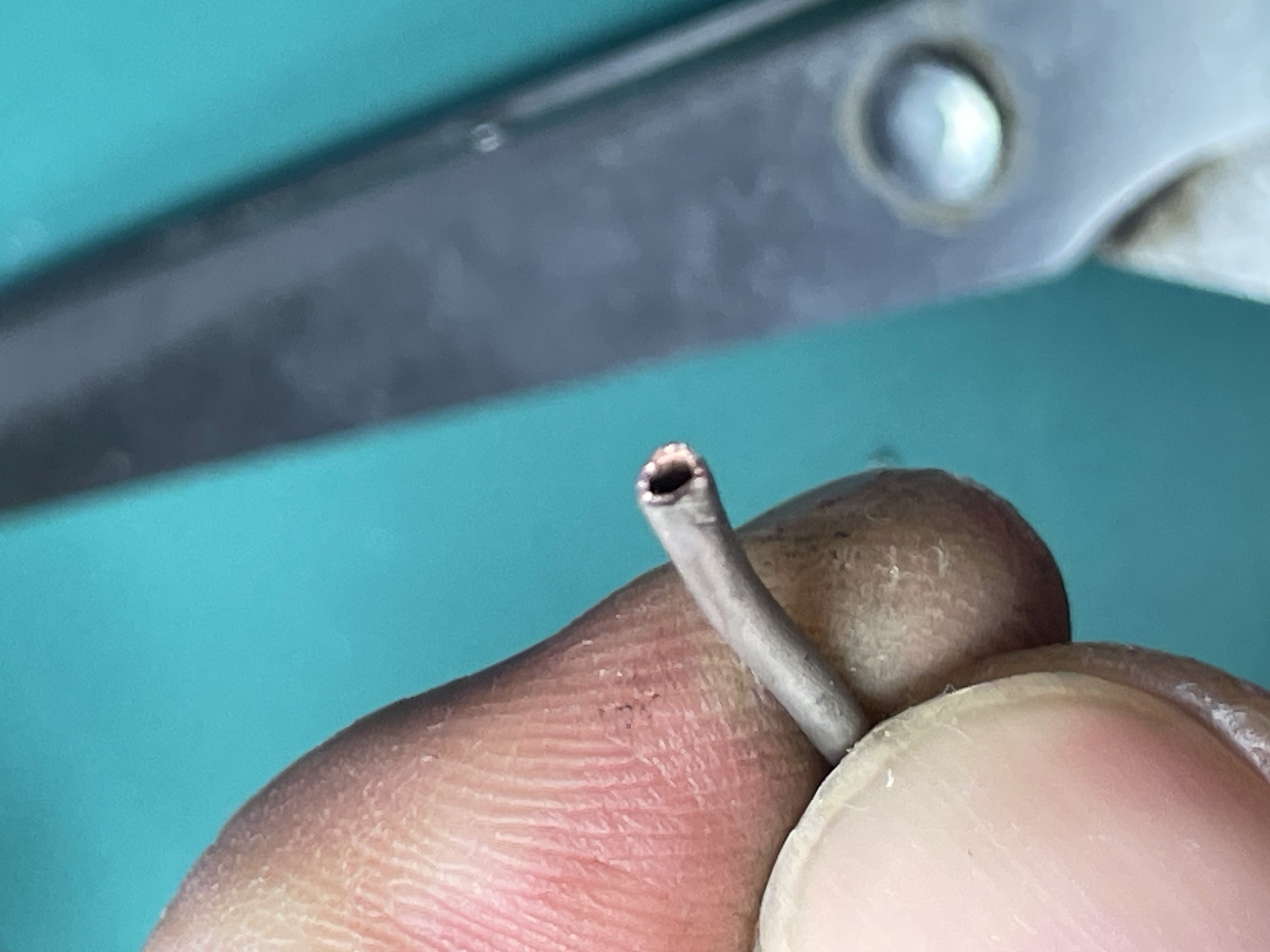 J’ai simplement coupé le bout du tube de quelques mm et branché mon compresseur avec un mini tuyau d’aréographe et un mano pour contrôler la pression. Une fois bien stabilisée je pince le tube fortement, et je remets une goutte de soudure à l’extrémité. Ensuite je mets rapidement le bout dans un ramequin d’eau pour voir s’il n’y a pas de fuite… c’est bien artisanale :D