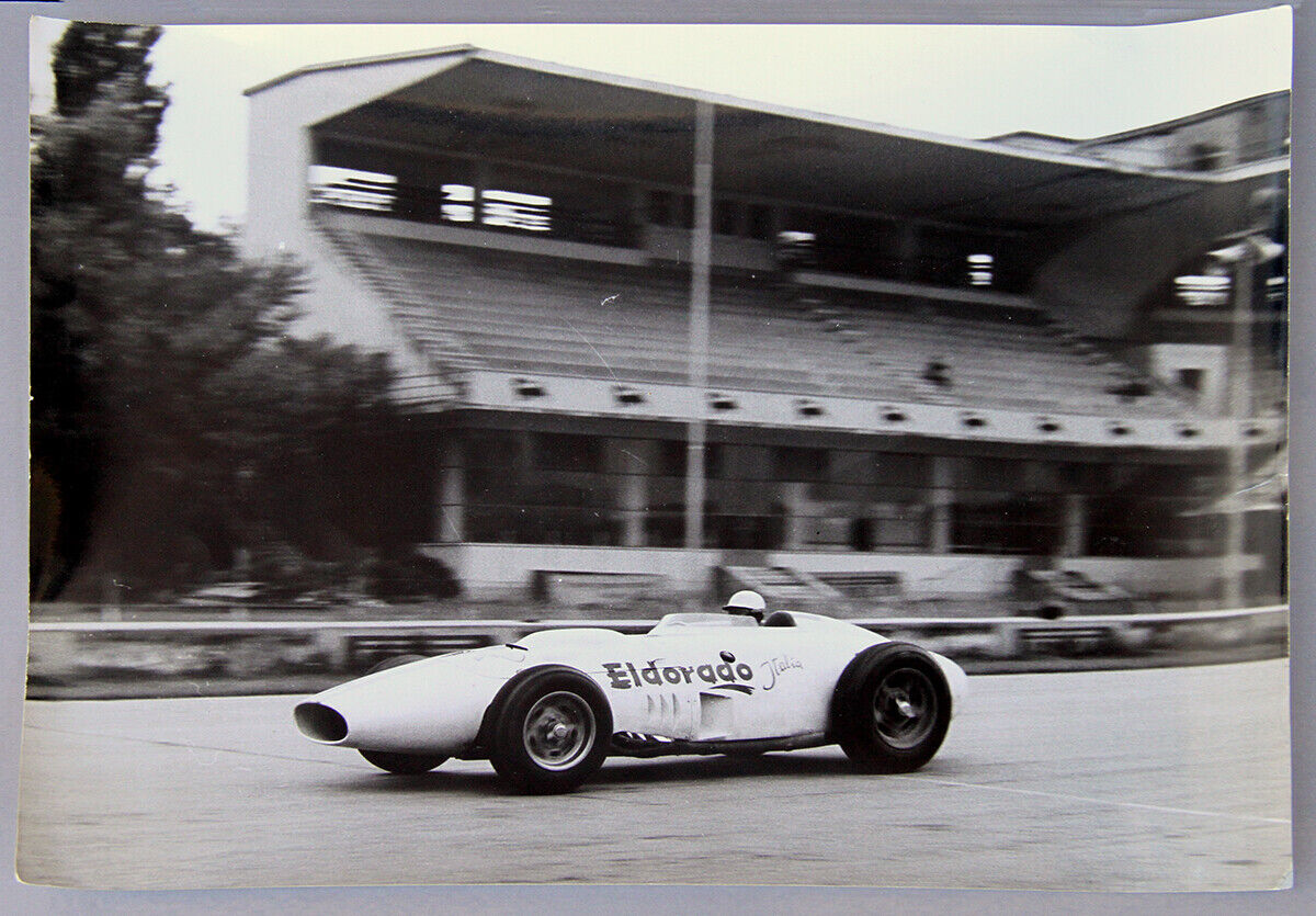 Ciao CBi, ça semble être la 420 M58 Eldorado en cours de gestation. La prise d’air pour les carbu est encore très fine et centrale et il n’y a pas encore de dérive . Il est vrai que c’était le V8 de 4.2 litres placé dans une 250F. Le pilote pouvait être assis assez bas car l’arbre de transmission passait à sa gauche. Le pilote casqué de blanc pourrait bien être Stirling Moss.