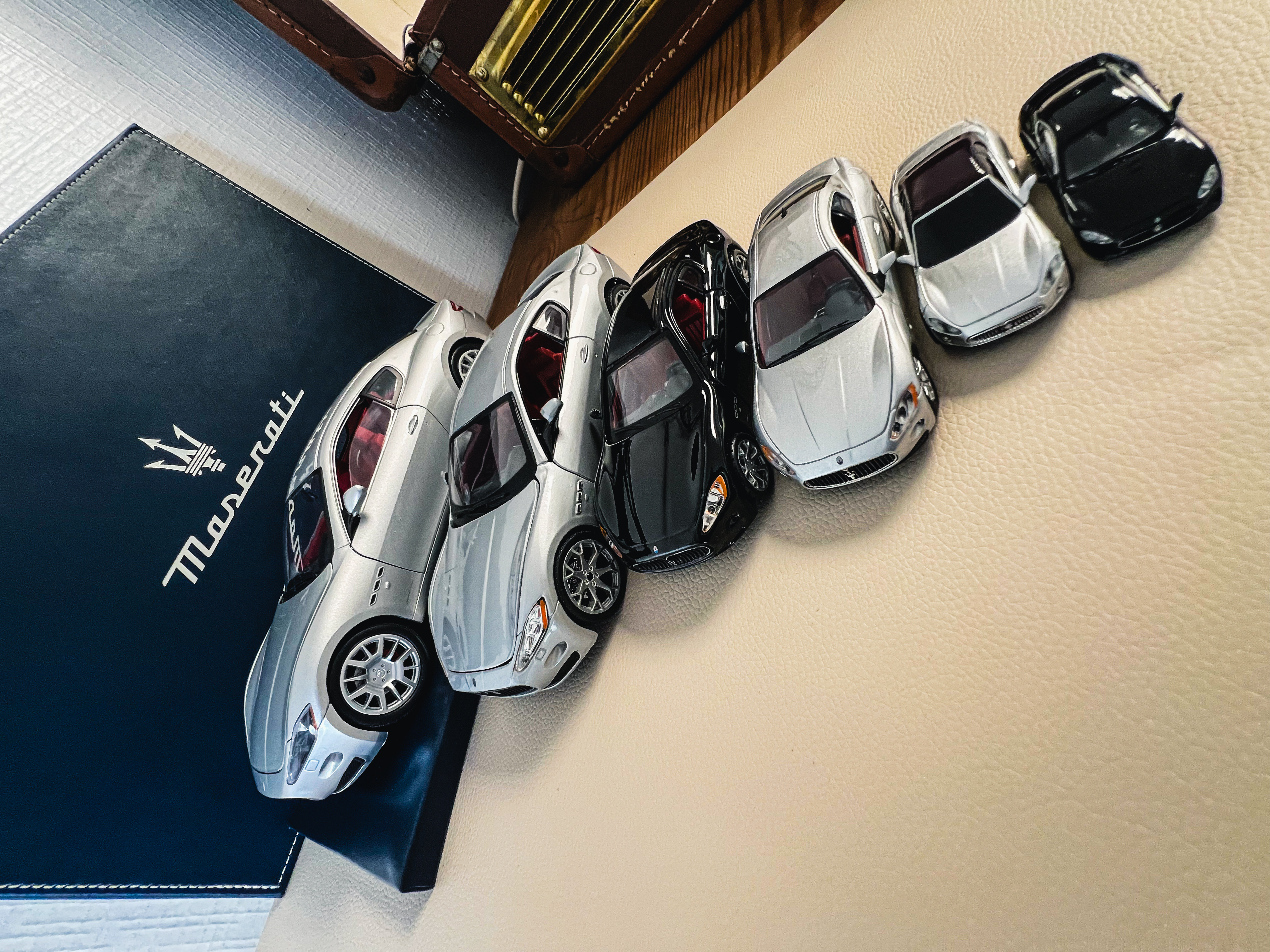 J'ai également débuté une collection 1/64, suite à une opportunité d'acquérir 12 KYOSHO pour une bouchée de pain! J'ai complèté avec un peu de MC20 et de Granturismo et je suis à une vingtaine de modèles. La aussi , j'aitrouvé quelques classiques et Biturbos pour couvrir la période 1957-2000. la aussi, aucun modèle avant cette date.