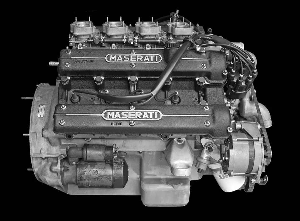 Ce noble V8 à quatre arbres à cames en tête, né sur commande de Tony Parravano pour l’installer dans des châssis Kurtis engagés aux 500 miles d’Indianapolis 1956, puis placé dans la Maserati 450S en 1957, dans l’Eldorado en 1959, dans les Tipo 151 du Mans en 1962-1965, dans la Birdcage Tipo 65 en 1965, connut une longue carrière « civile » depuis la 5000GT du Shah d’Iran en 1959 jusqu’aux dernières Quattroporte III en 1990 en passant par les Quattroporte I, Mexico, Ghibli, Indy, Bora, Quattroporte II Frua, Khamsin et Kyalami.