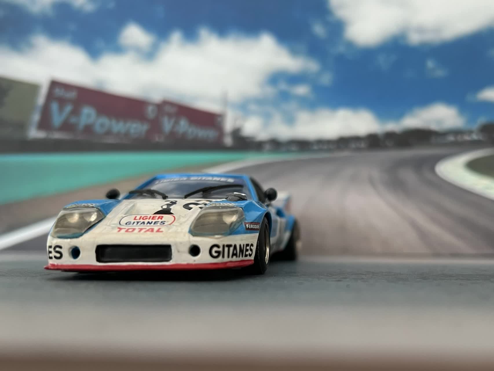 Je trouve ce premier test "simulation dynamique" plutôt encourageant, mais avec des défauts encore à corriger, en particulier il me faut imprimer une piste avec les mêmes traces en perspective de façon à améliorer la fusion support/décor. La vitesse réelle n'existe pas mais l'illusion de vitesse est crée par les décors imprimés.