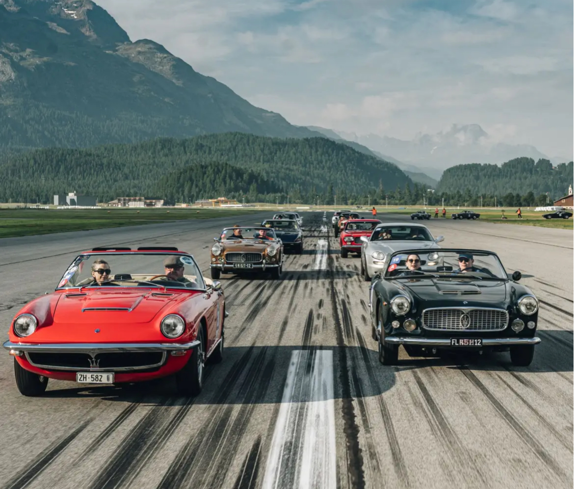 Pour fêter les 110 ans de Maserati, les bolides ont été lâchés sur la piste de l’aéroport de Saint-Moritz. Photo Eugenio Clamer pour Passione Engadina :