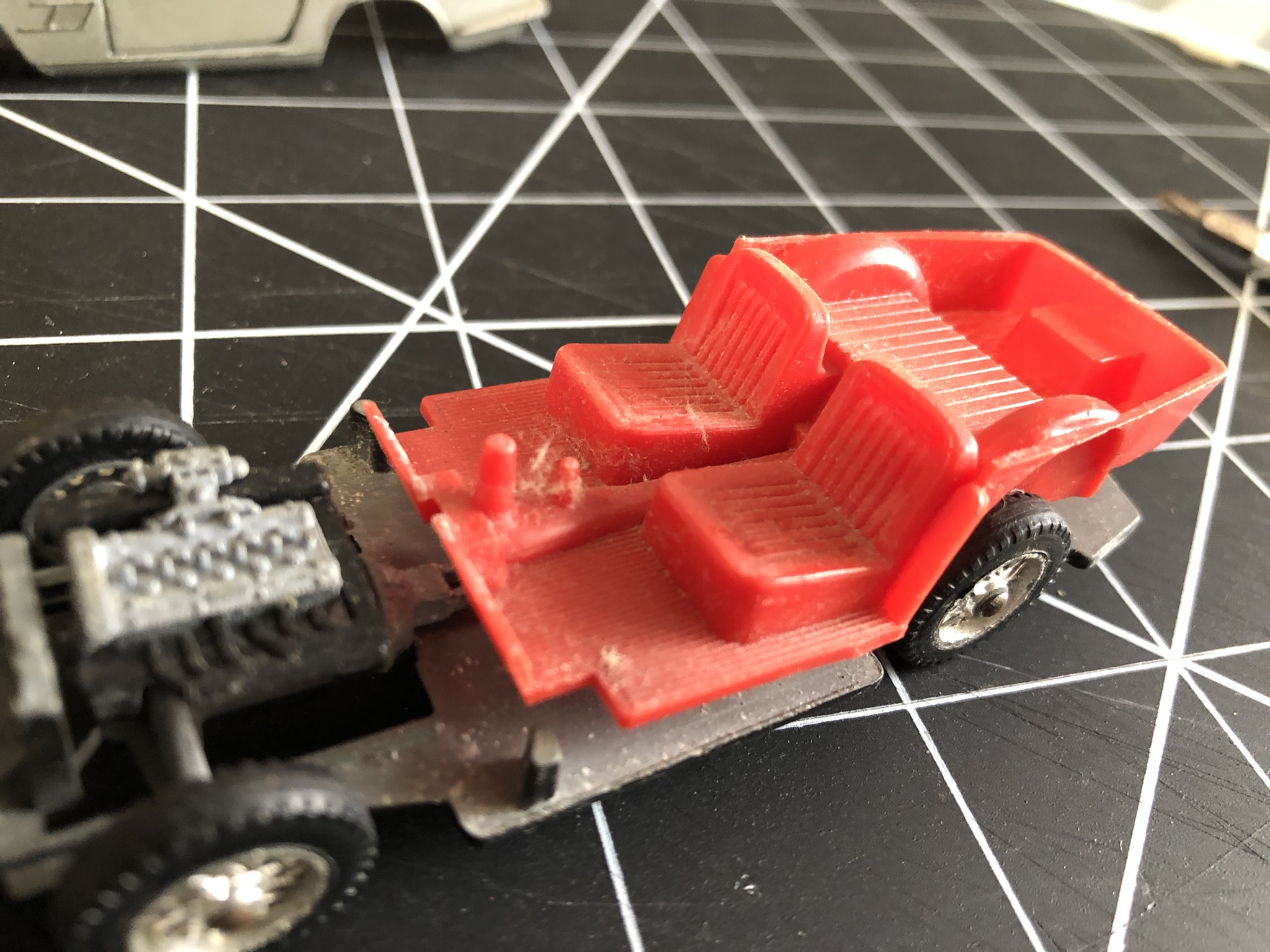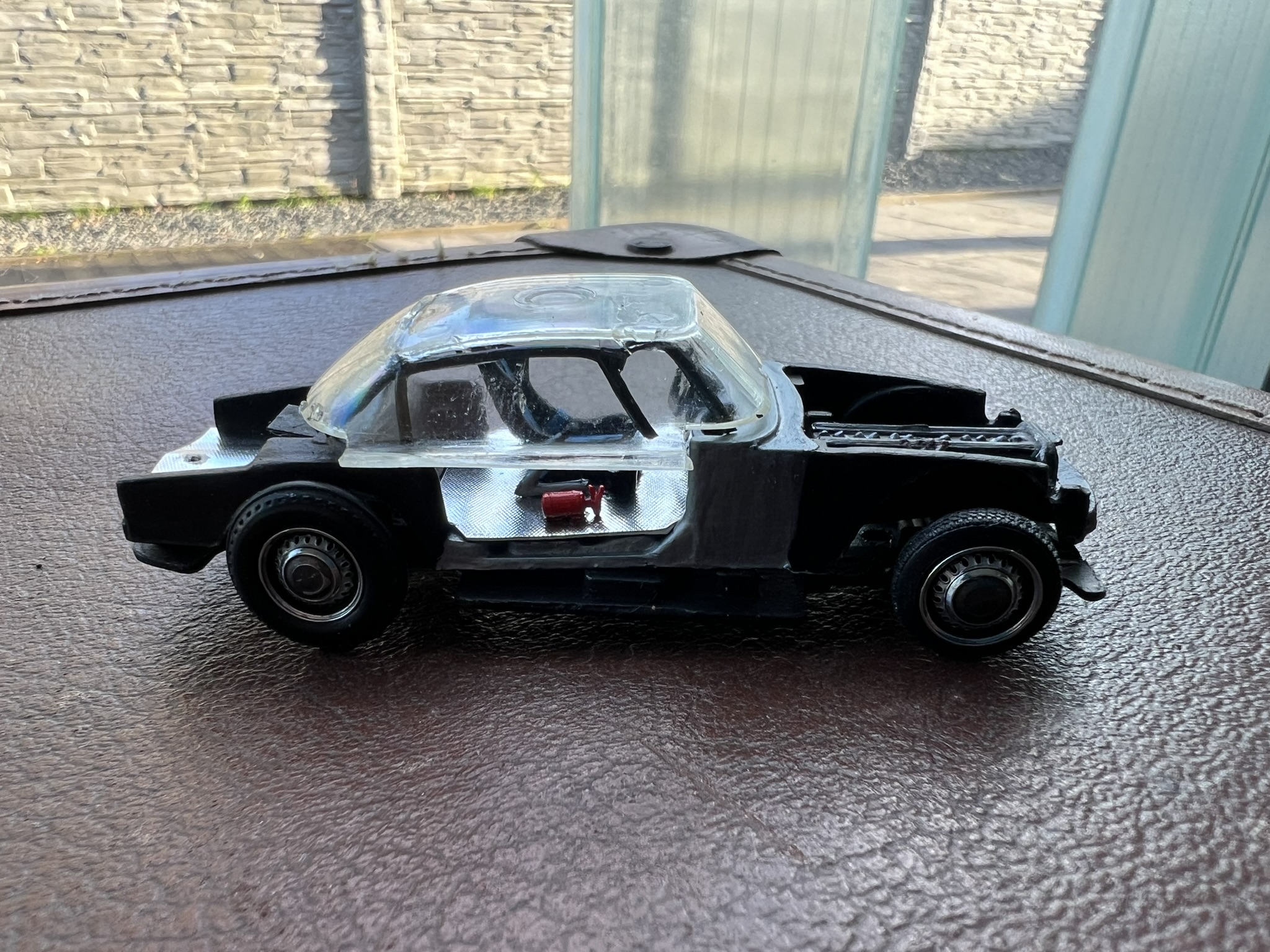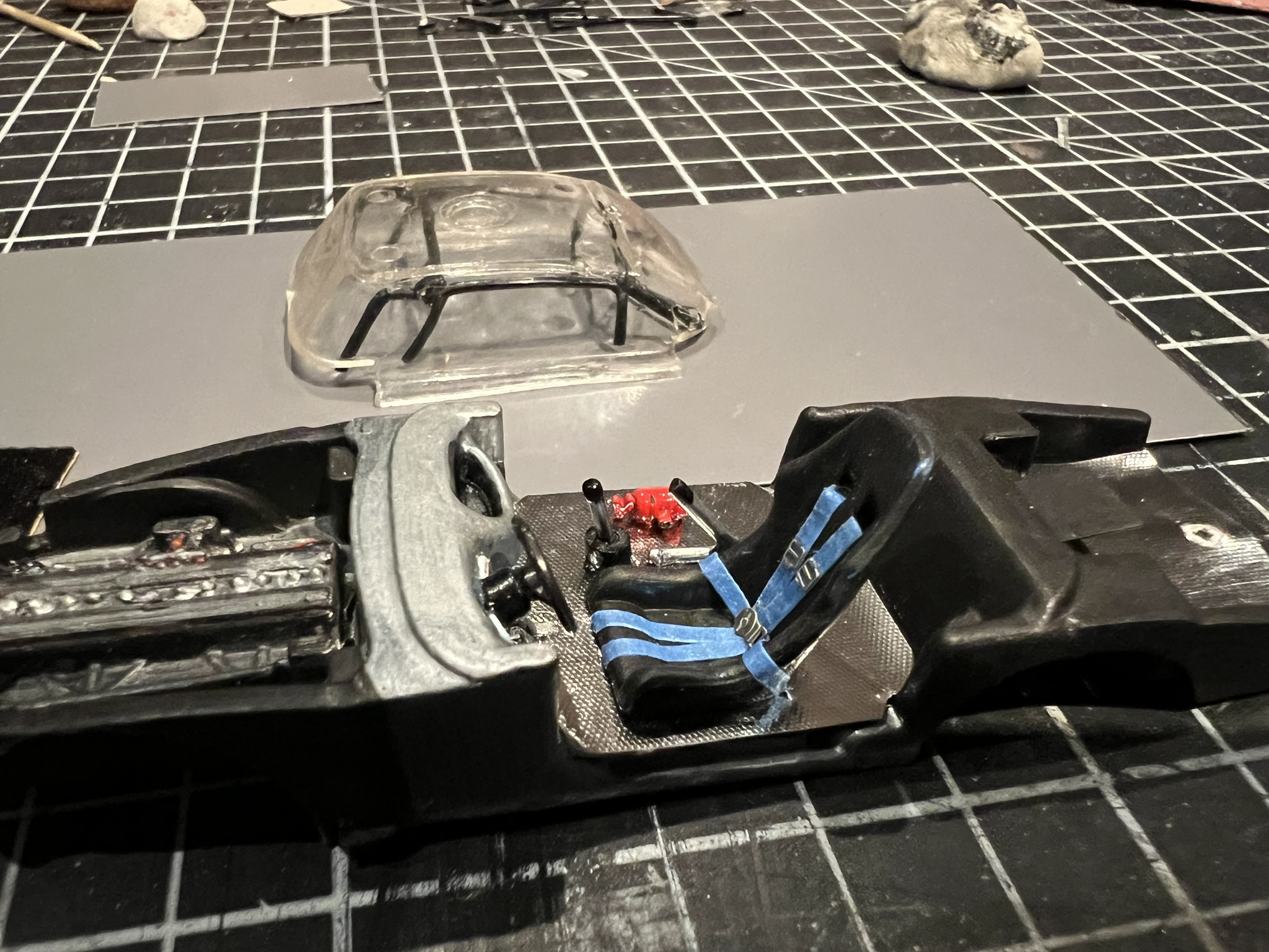 Et je dois ajuster un intérieur complet en mode course : Je prends une 4200GT Trofeo abimée qui donnera arceau, volant, siège et extincteur. Autant le faire avant la finition peinture.