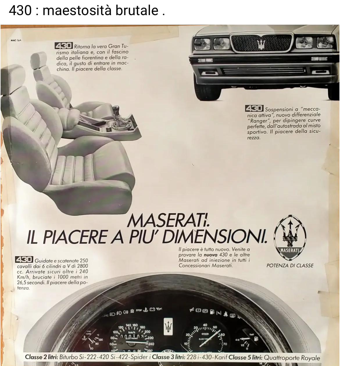 Les 430 ont un 2.8. Y a pas de 3.0 en v6 dans les biturbo. 2.0, 2.5, 2.8.maseramo a écrit : ↑jeu. 8 déc. 2022 23:57 Cependant, soumisse à la taxe de 38 % frappant en Italie les autos de plus de 3 litres, la 430 fut surtout vendue sur les marchés d’exportation. Il fallait pour l’Italie que la berline Biturbo, la « 4 » nouvelle gamme (seconde génération), ait un moteur de 2 litres (18 % de taxes), ce sera la 422 …