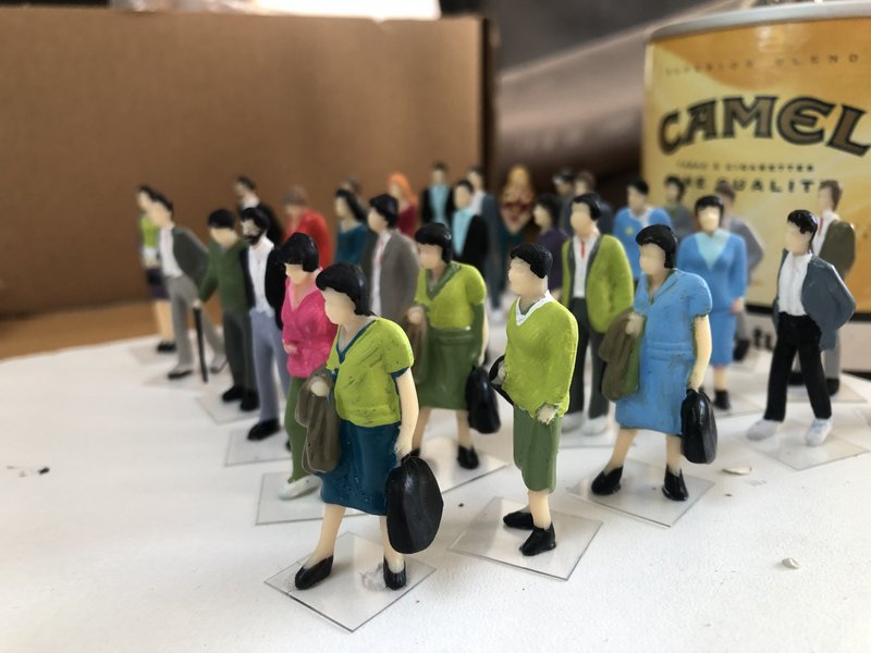 * Les figurines de "remplissage", qui ont des attitudes standards et qu'on trouve à peu près partout, peintes ou non et vendues par lots (de 50,100,...on retrouve toujours les mêmes...mais ça remplitJe reprend la peinture de chacune d'entres elles, car c'est souvent fait rapidement et dans des couleurs toujours identiques. C'est très bon marché ( 0.25€ pièce)