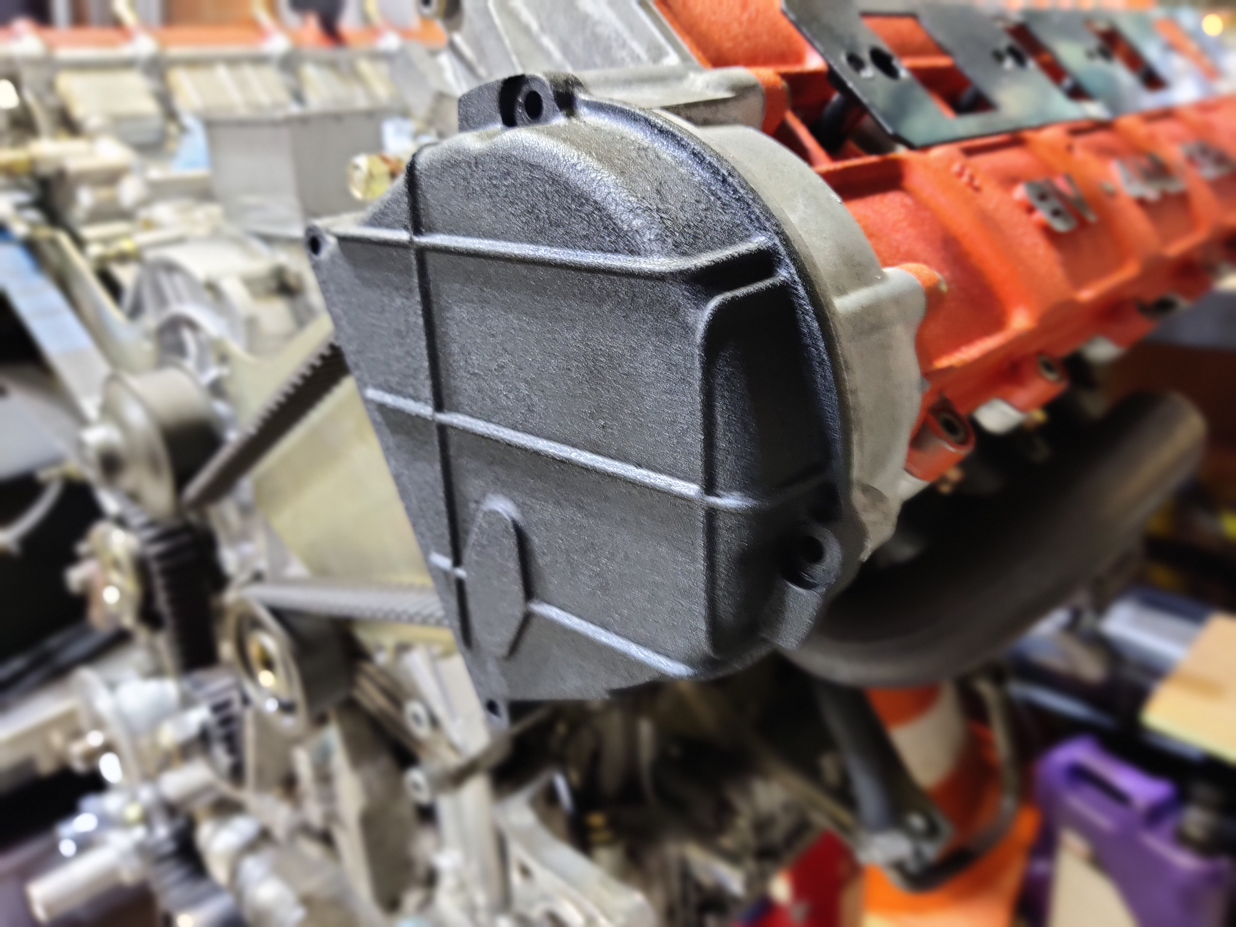 Une fois l'ensemble pompe à huile et à eau en place, on peut remettre les deux plaques qui séparent la courroie de la pompe à eau (notez qu'à droite, il manque encore un bout, mais c'est parce que je n'avais pas encore remis les pastilles, donc pas l'AAC non plus lorsque j'ai fait ça).
