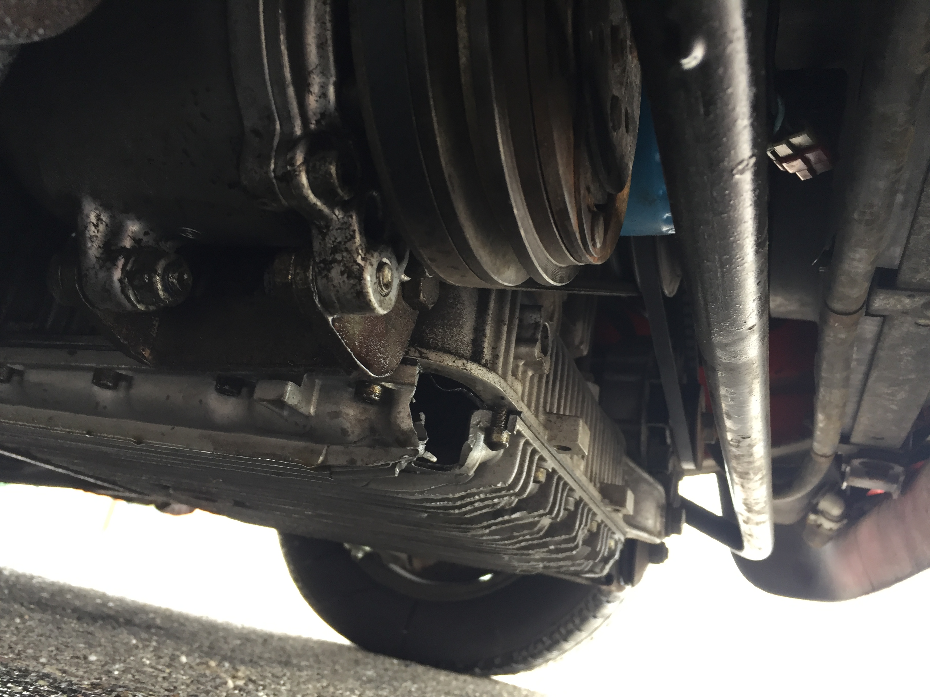 Angle carrément arraché, peut être déjà un choc et le carter fragilisé , surtout que toutes les ailettes sur le devant sont cassées. :o
