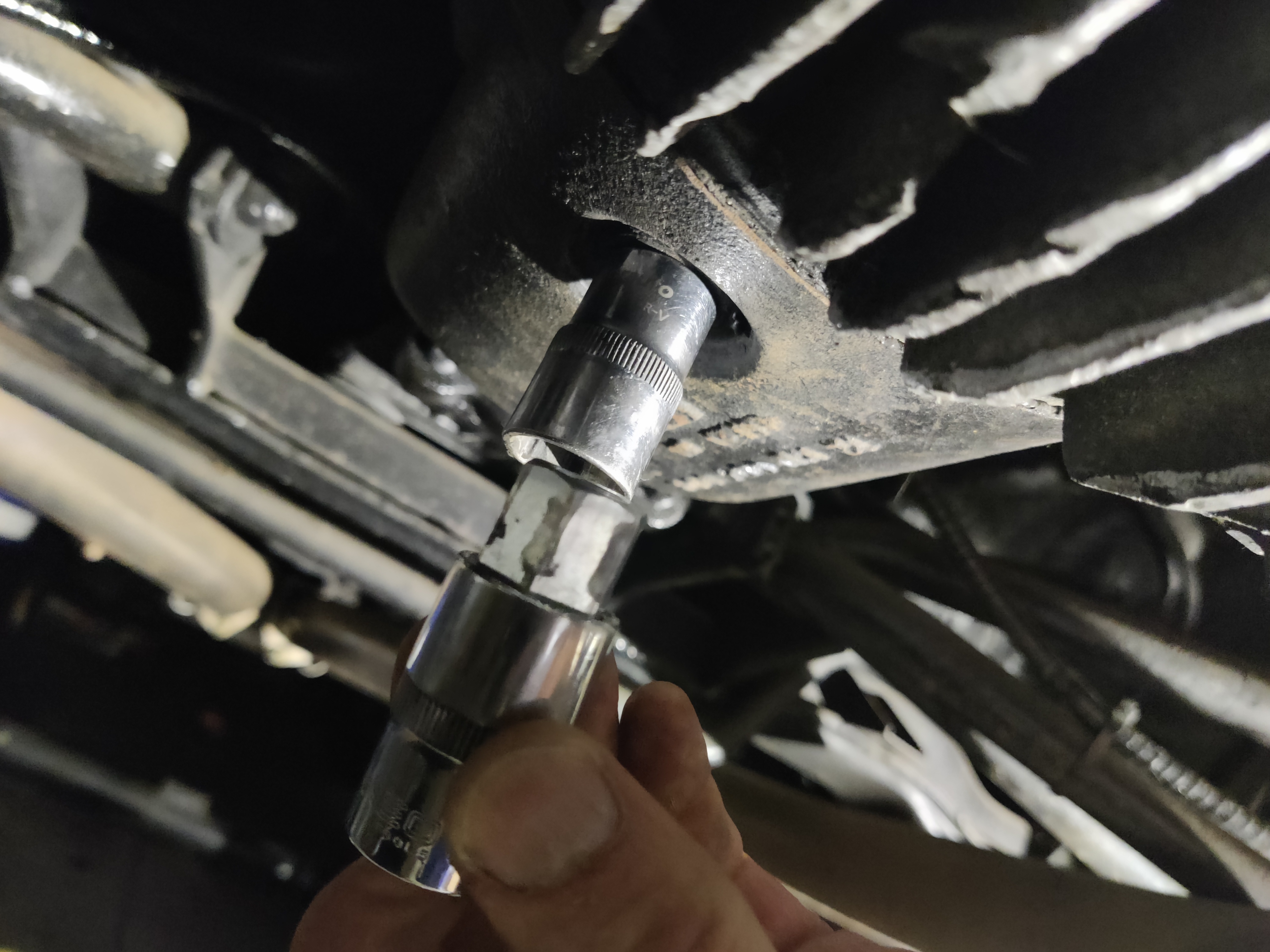 Donc, vidange du dif, bien entendu c'est encore un bouchon mal foutu avec un embout carré, un peu renfoncé qui plus est, une clef plate passe, mais impossible d'avoir assez de force.
