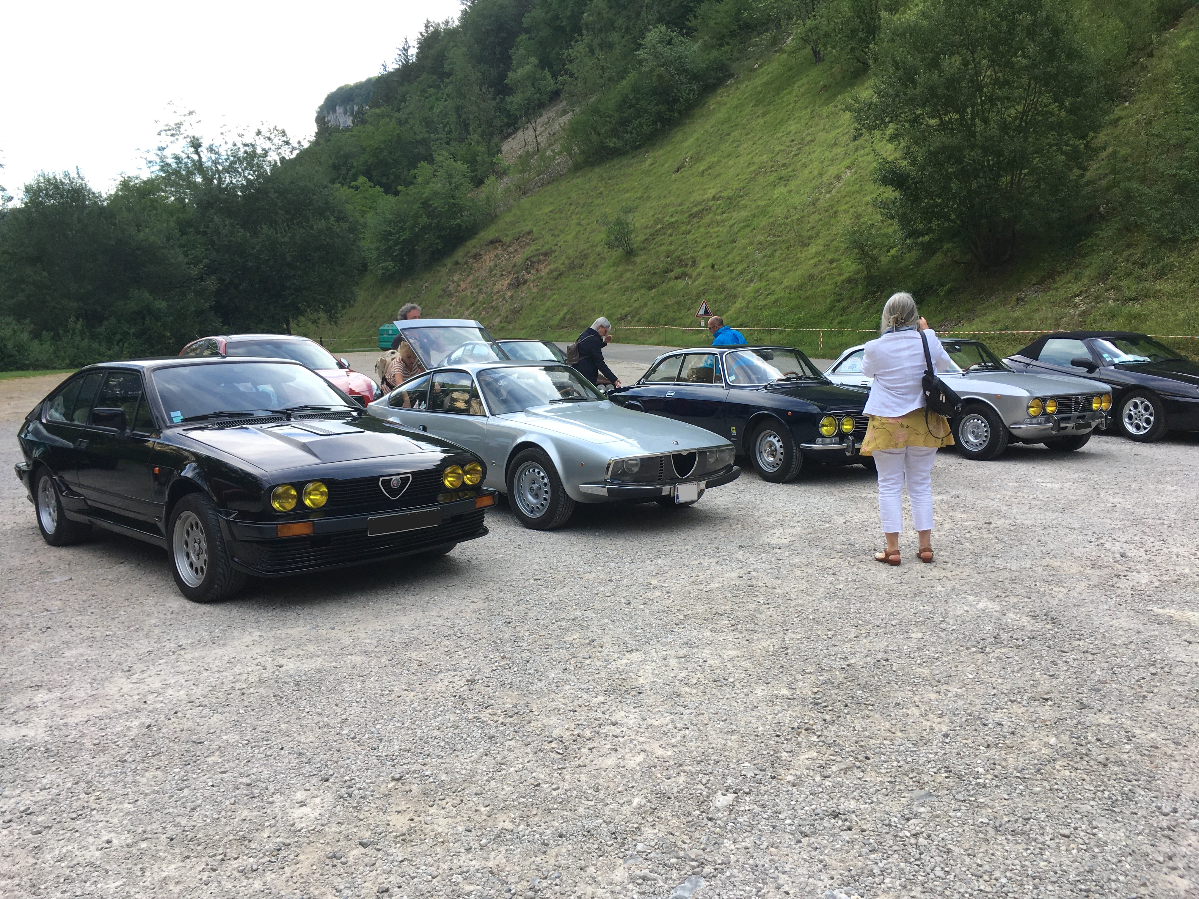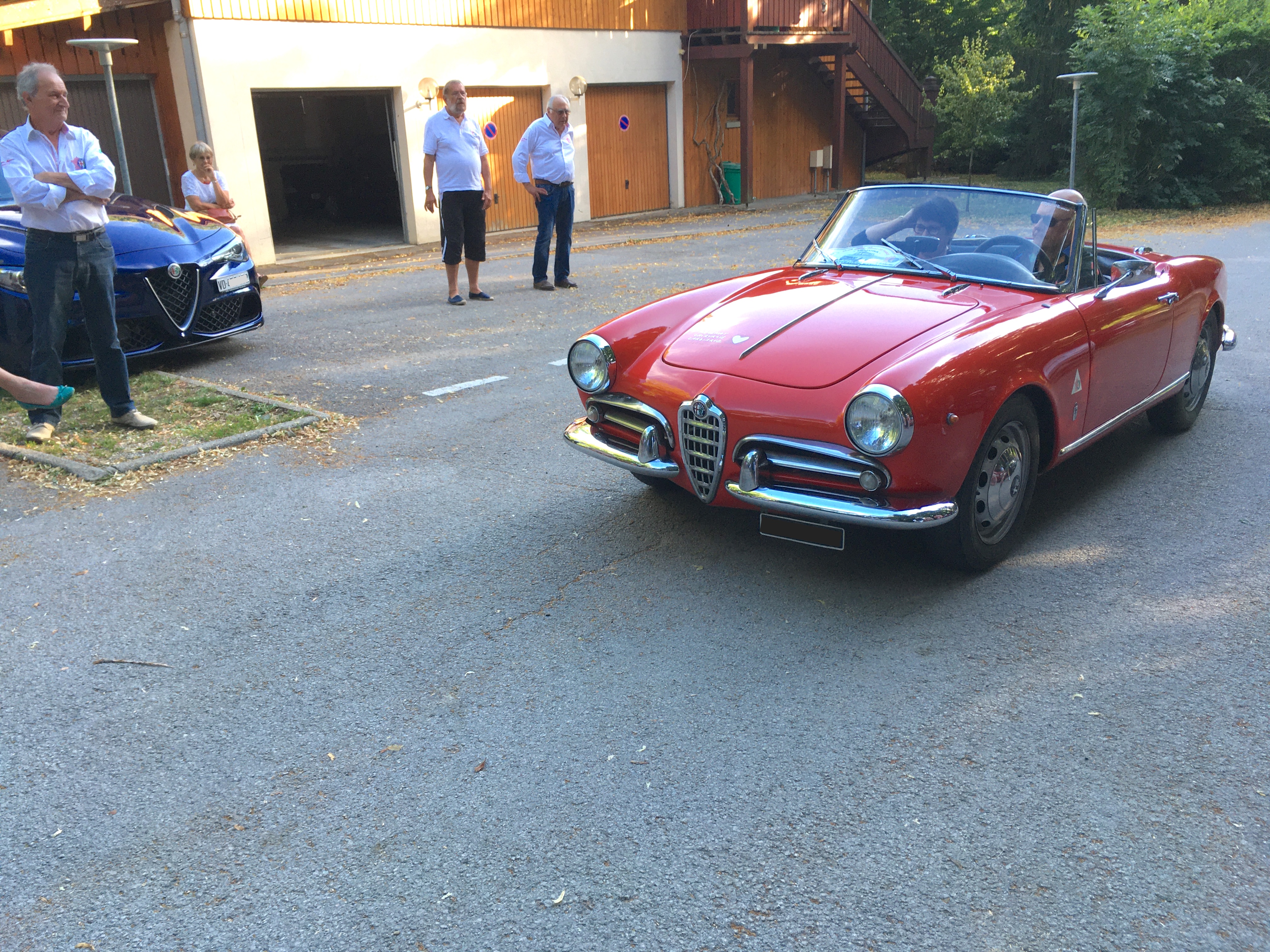 la Giulietta Sprint Veloce juste au parking des salines royales dimanche matin. Sur la route : ces gens là sont partout.... Au resto du dimanche midi Clin d’oeil avec fourchette à fondue... Très beau temps, beau plateau, bonne ambiance....