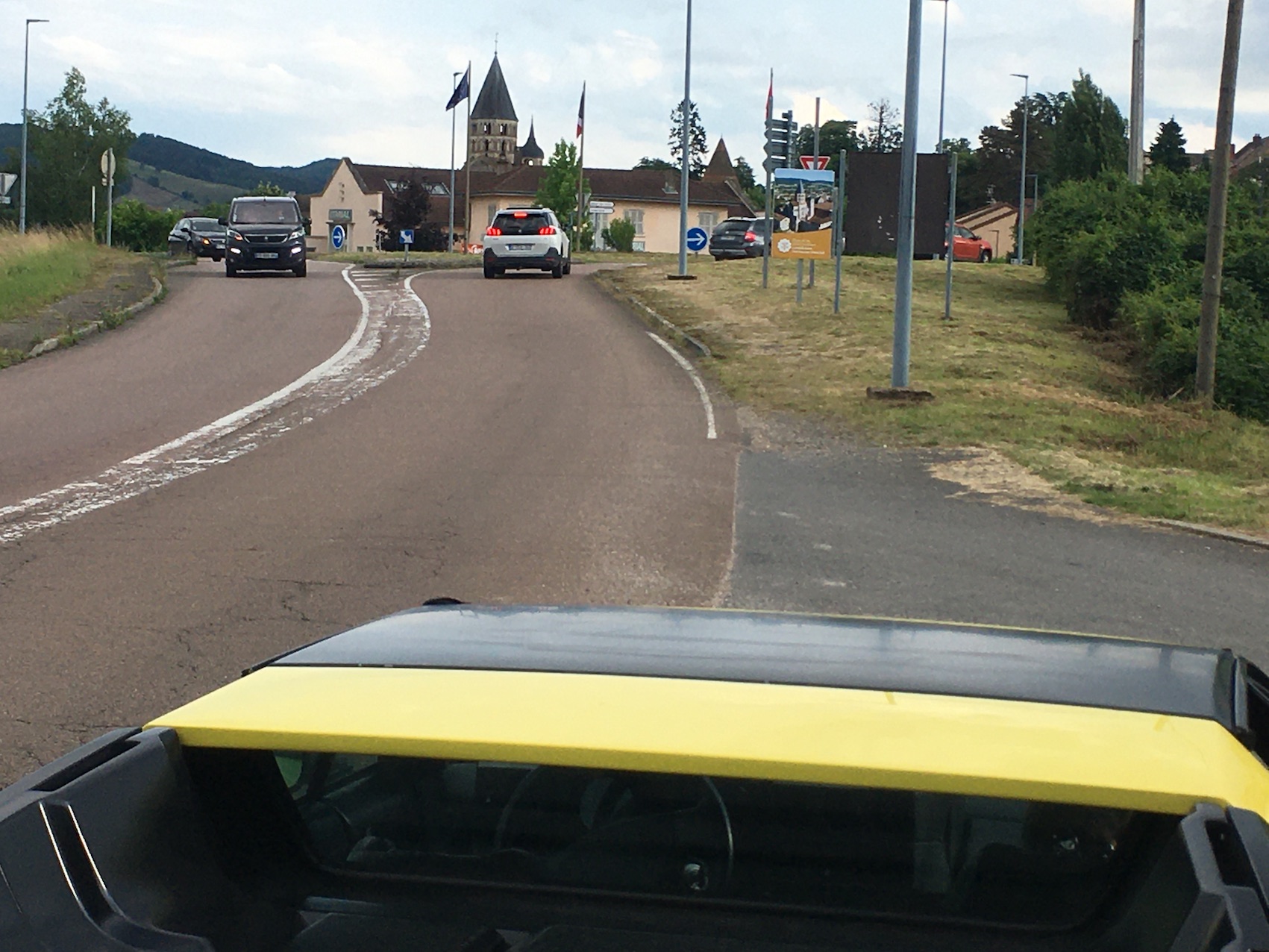 Arrivée triomphale, photo avec le "zapointe -pardon le clocher de l'eau bénite...-" en arrière plan. Rejoint par un pote de promo (le même que l'an passé), local de l'étape, avec sa Venturi coupé 200 ch. Le samedi après-midi, petite promenade découverte. Michèle trouve la Venturi confortable.