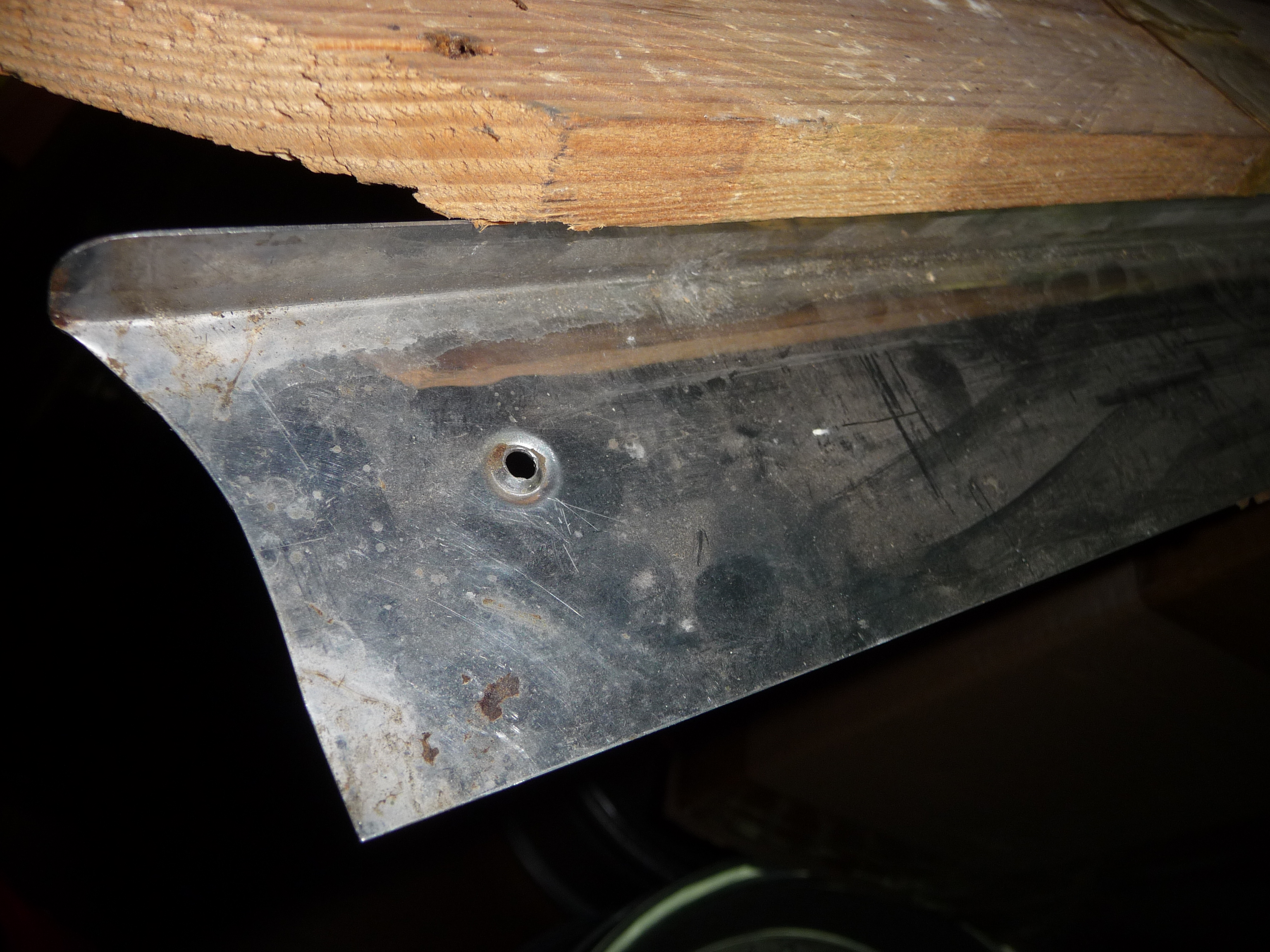 Cette tôle est en assez bon état, l'aspect de surface du dessous montre que c'est le même type de matériau que les grandes tôles latérales sur les flancs, une sorte d'inox: