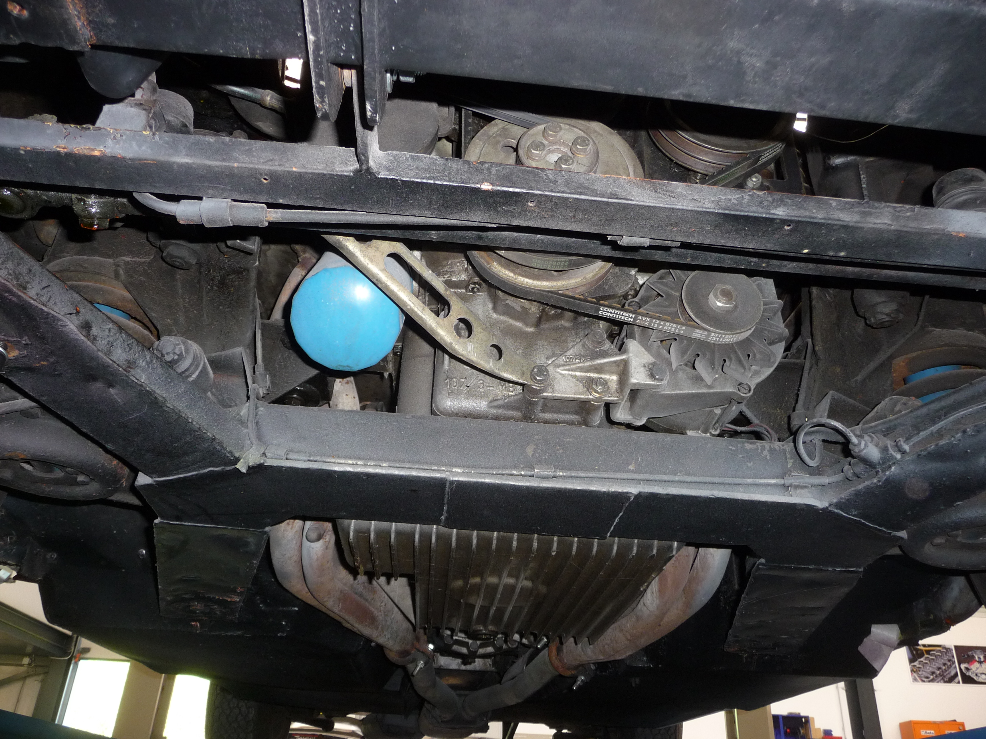 On voit ici sous la partie avant les vis de fixation des attaches de silent-blocs de la barre stab, sous le longeron du berceau AV (au centre de la photo) et plus loin au niveau du triangle de suspension.