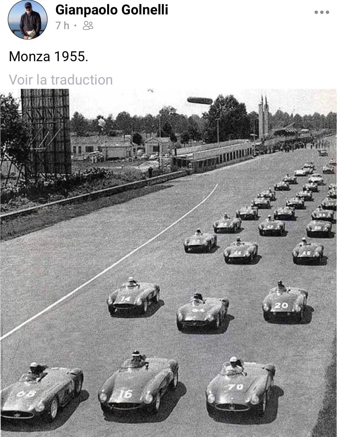 C’est la course Supercortemaggiore à Monza, réservée aux barquettes catégorie Sport 1000 km en 5h40 à la moyenne de 177 km/h. Victoire de Behra Musso sur la Maserati 300S à gauche :