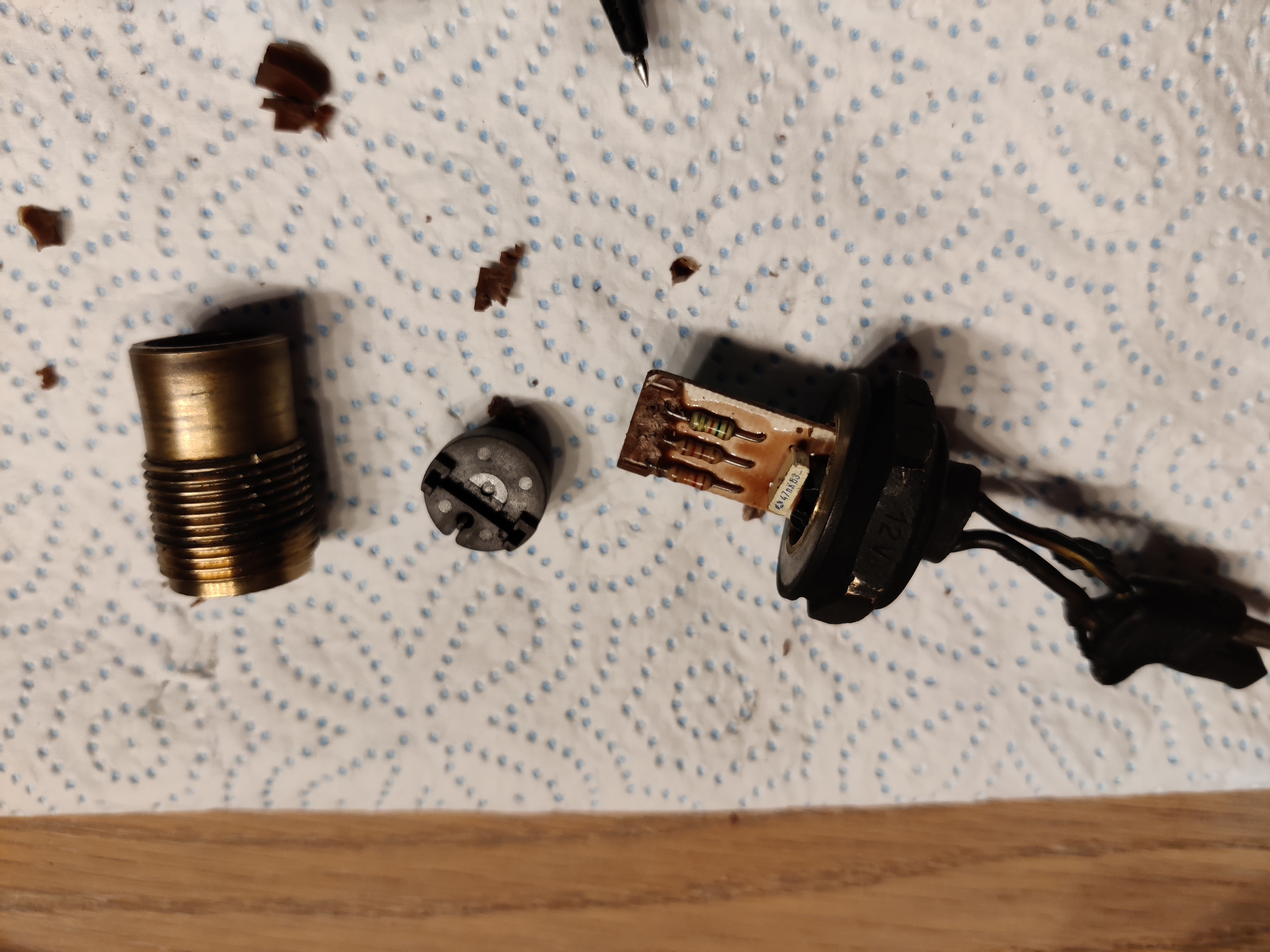 Armé de mon multimètre, je me mets donc en tête de tenter la réparation, mais malheureusement, il est FUBAR. L'extrémité devrait être relié à deux bobines qui seraient dans le capuchon brun, et il n'y a aucun câble qui relie les deux parties, et je ne trouve pas où commence les dites bobines.