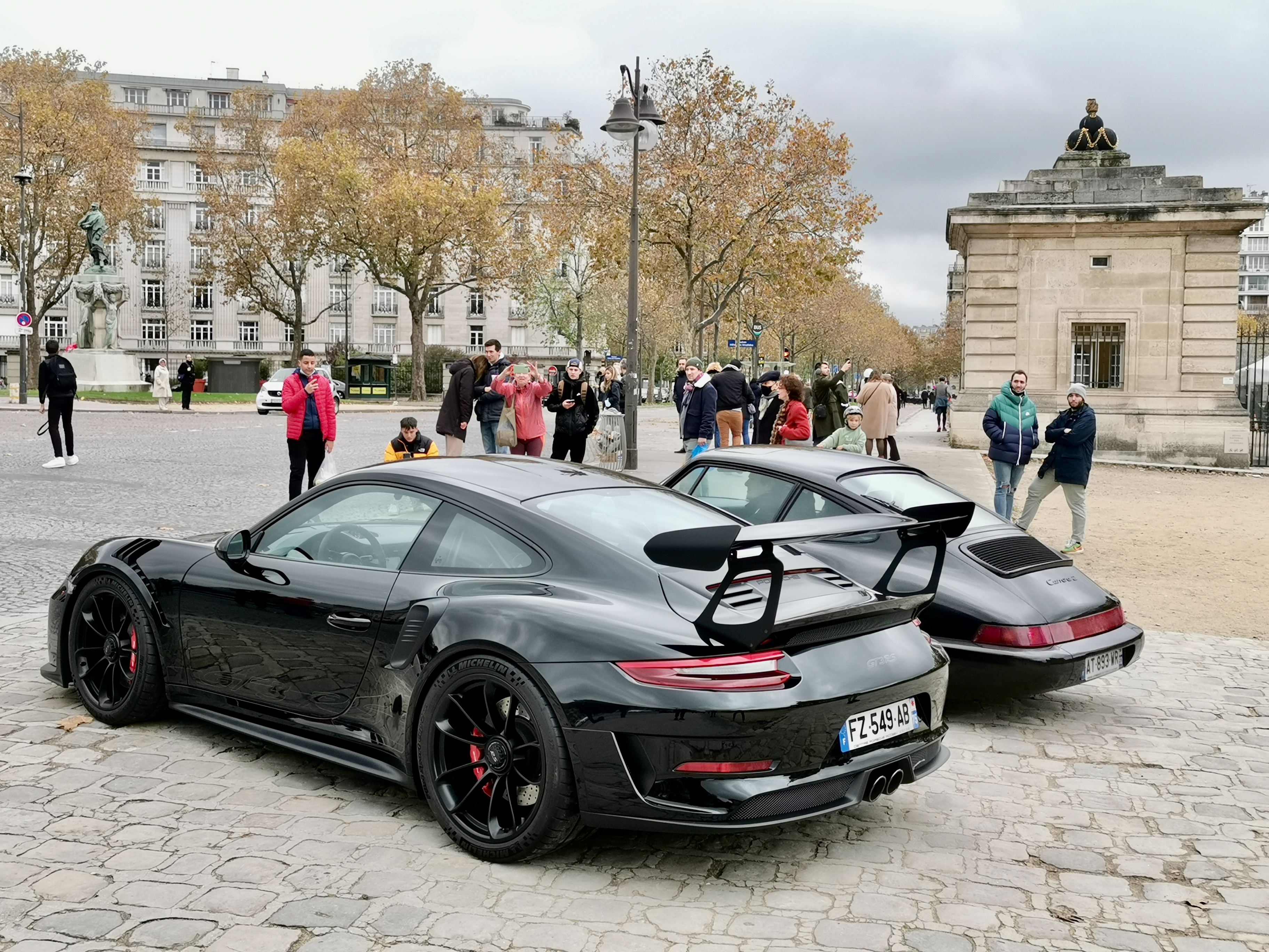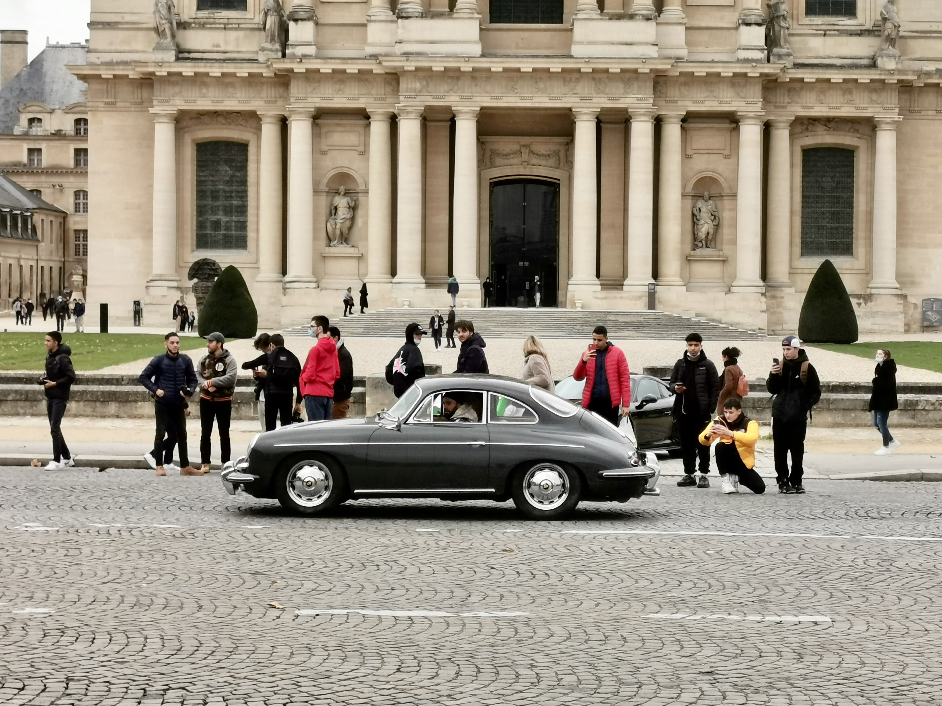 Sous le porche des Invalides, plusieurs générations de Porsche.