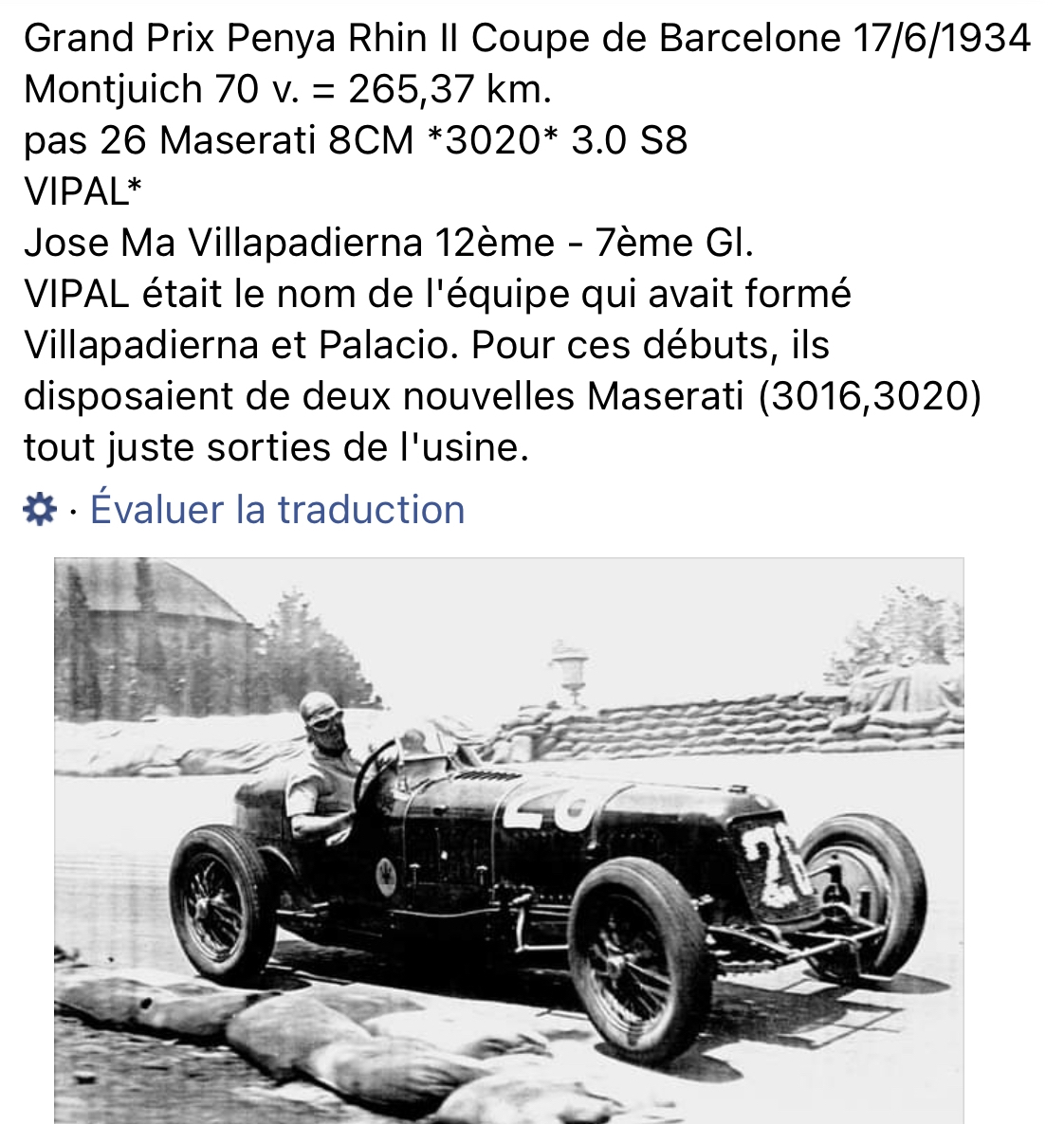 Ce sont des Tipo 26 M (8 cylindres en ligne, 2.5 litres à compresseur, 185 cv pour 800 kg, 230 km/h). Ernesto Maserati en blanc est au volant de la numéro 10.