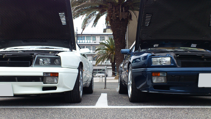 Ci-dessous la bleue est une Cup 2.8 litres avec les retroviseurs rabattables et les phares rectangulaires, la blanche probablement une GT ou une Cup 2 litres repeinte :