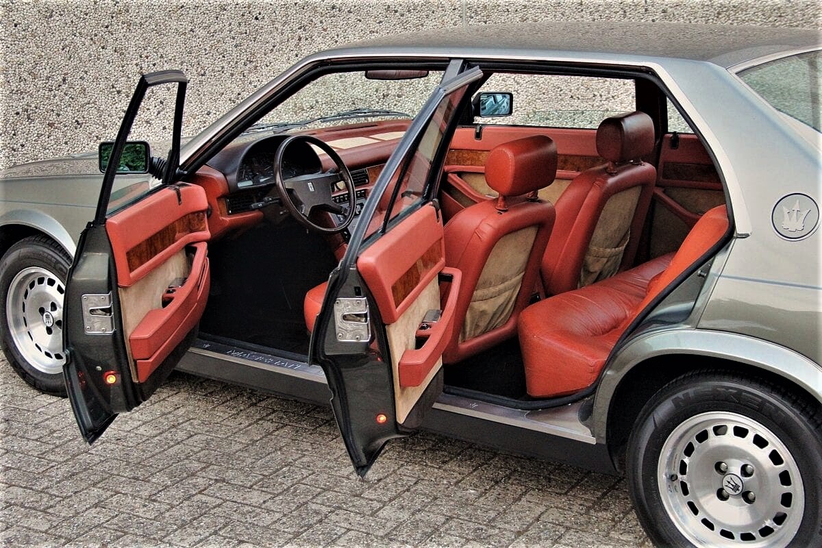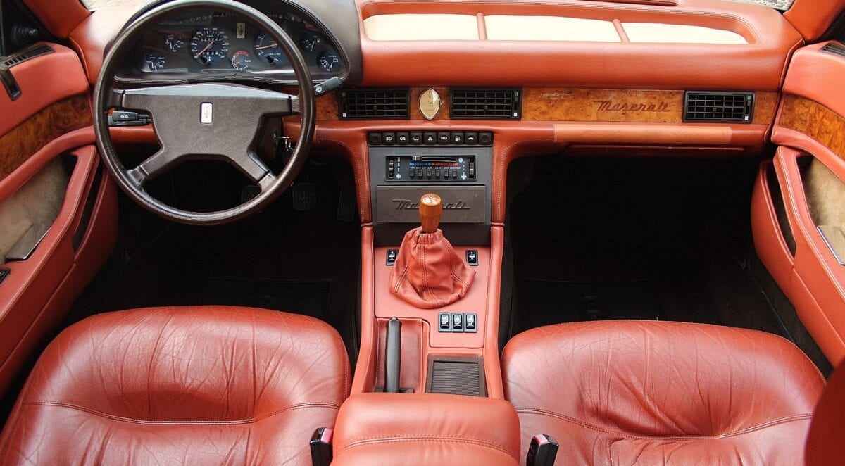 Dans l’épopée Biturbo, la 425 a ainsi inauguré pas mal de choses : les 4 portes bien-sûr mais aussi l’appellation numérique (425), le tableau de bord arrondi, la montre Lassale, l’inscription Maserati sur le (vrai) bois de la planche de bord et de nouvelles poignées de portières :