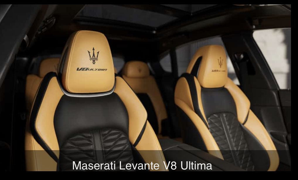 La Levante Ultima peut recevoir une peinture Nero assoluto ou Blu Royale ou (peut-être aussi, je n'en suis pas certain) le Blu Scià di Persia. L’intérieur est assez proche de la Ghibli Ultima sauf la présence de cuir sur les assises et dossiers et bien sûr pas d’inscription 334 mais V8 Ultima sur les appuis tête :