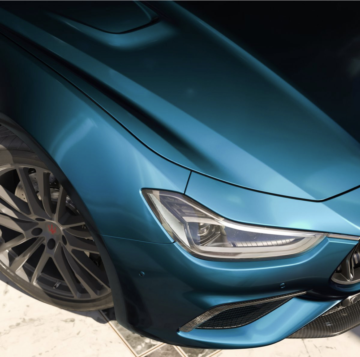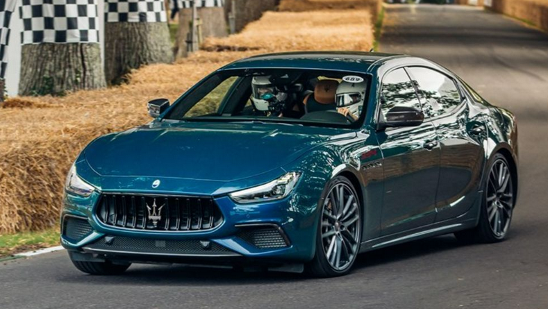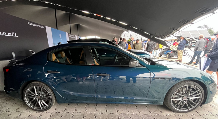La Ghibli Ultima 334 sera livrée uniquement dans cette magnifique couleur Blu Scià di Persia, avec des reflets de vert. Ci-dessus au Goodwood Festival of Speed qui fête cette année ses 30 ans.