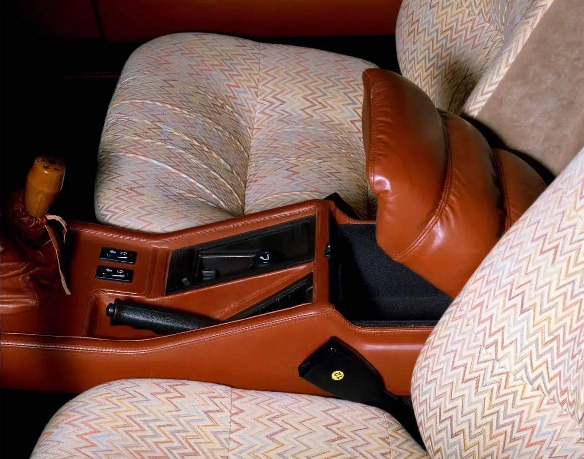 Le lien avec la mode, c’était le couturier Missoni qui avait déjà signé le beau velour intérieur « maron glacé » de la Biturbo de base (qui se mariait avec toutes les couleurs de carrosserie) et proposait en 1983 un tissu assez clair à chevrons pour la Biturbo S :