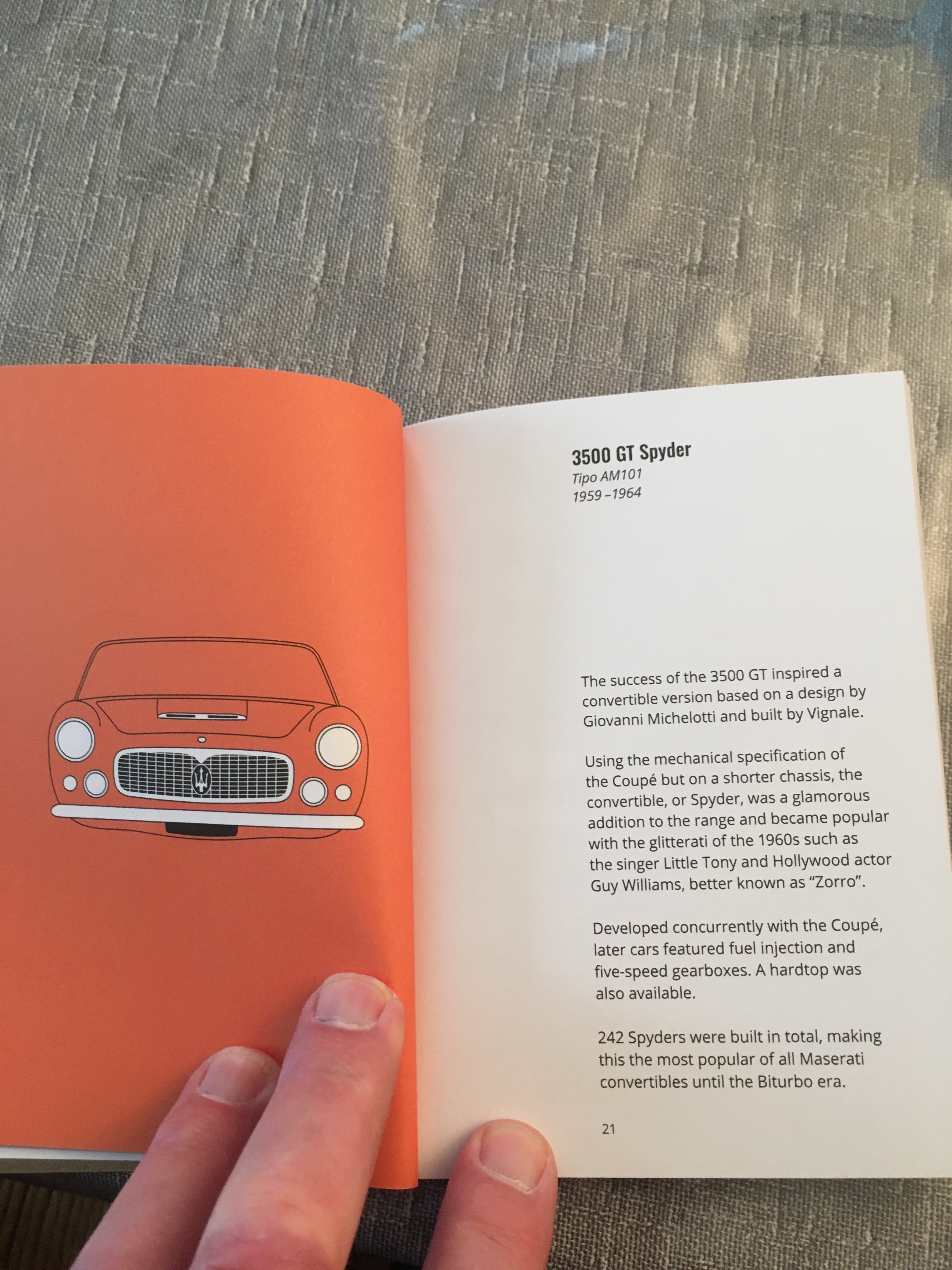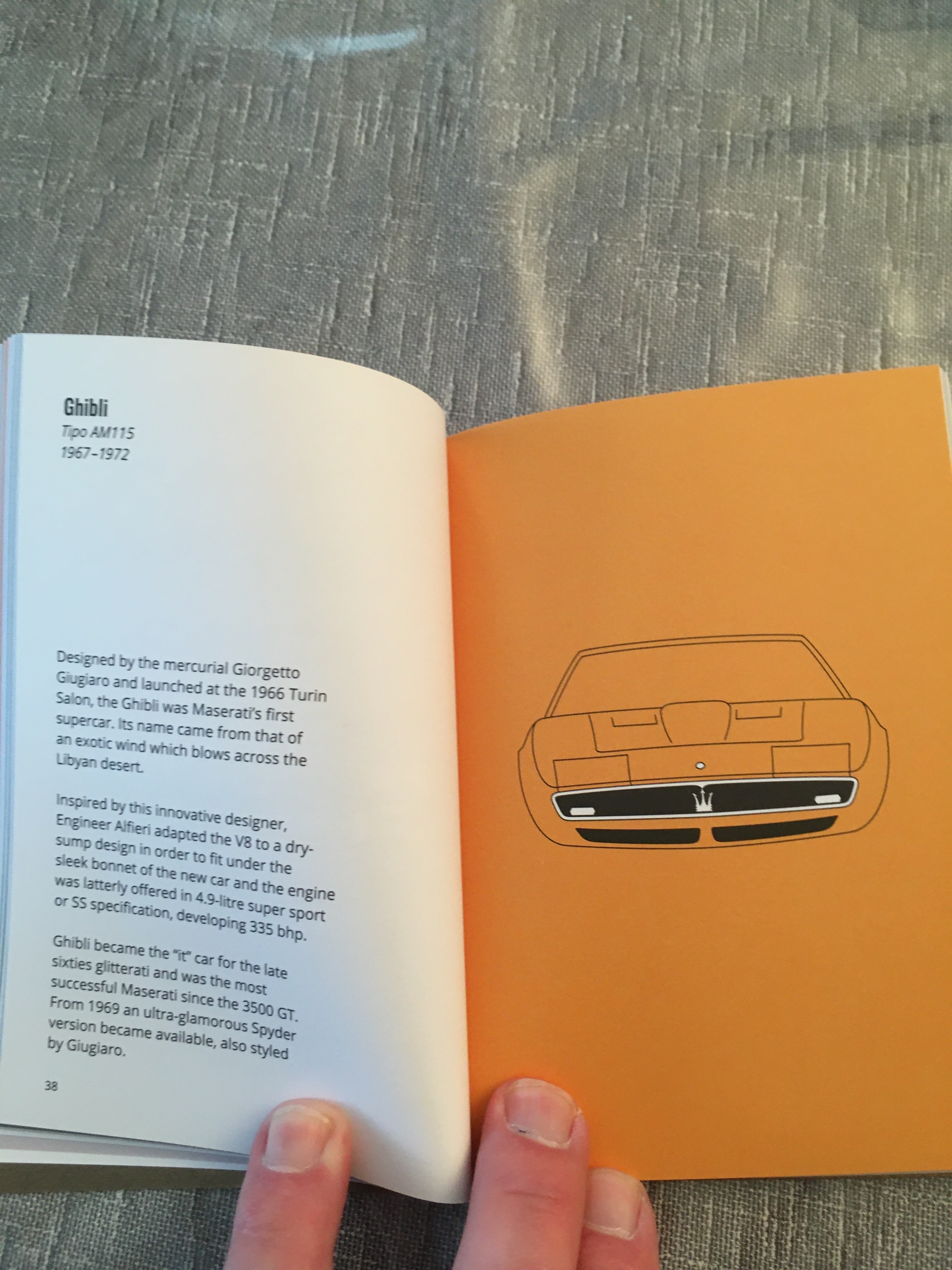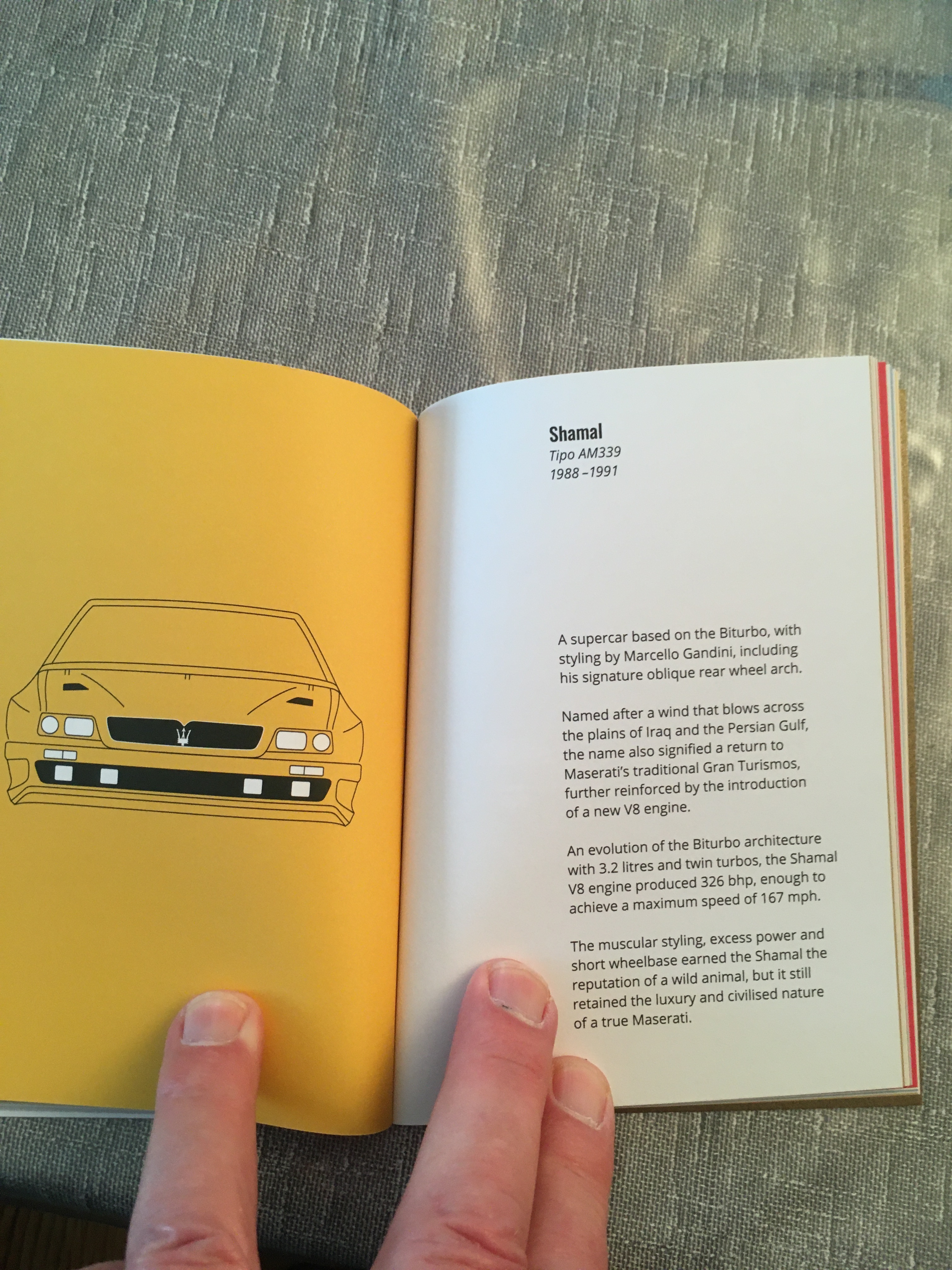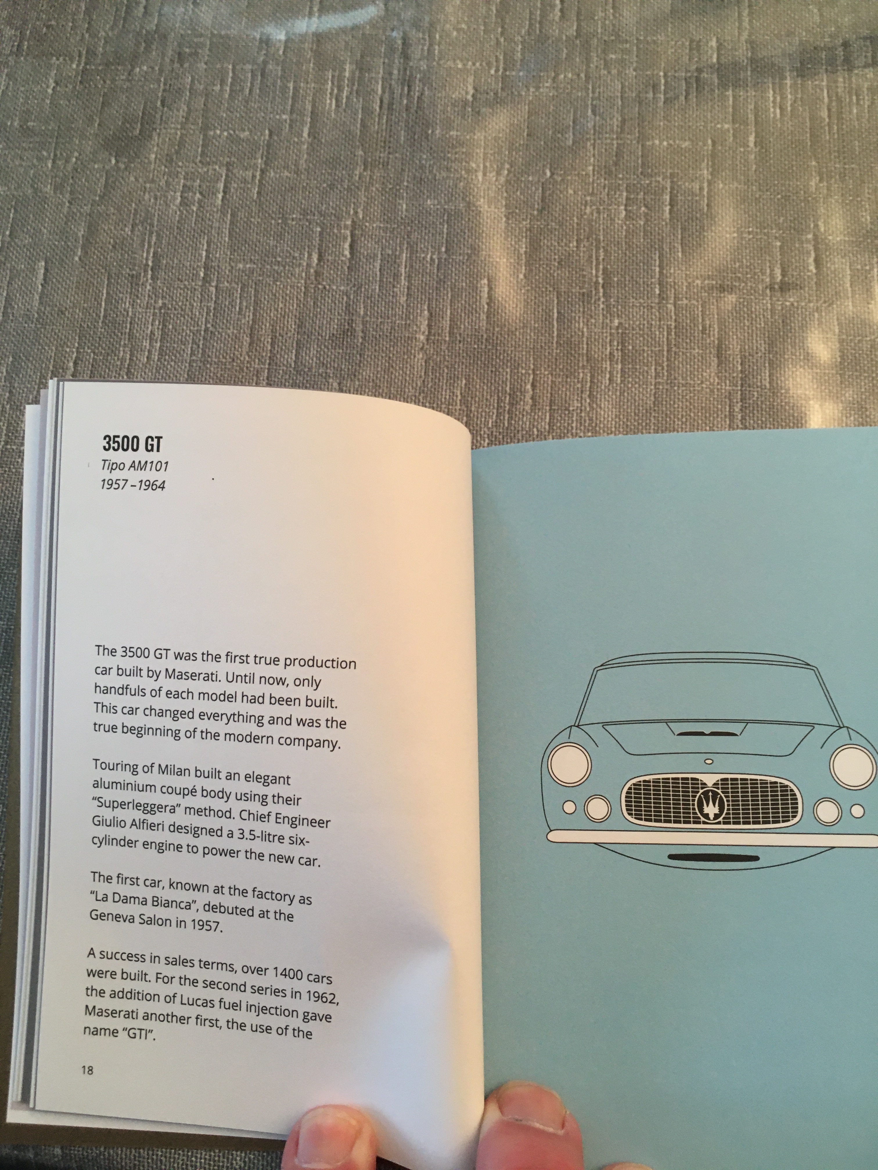 Bref: un petit livret retraçant les 110 ans de Maserati, avec pour chaque modèle une image de l'avant stylisé, et un petit texte: