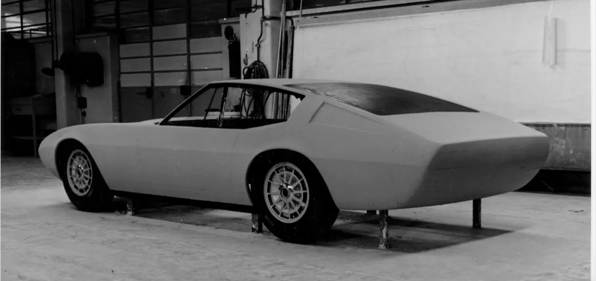 Un peu plus tard (la photo est datée de 1966) = la voiture est au niveau prototype, mais n'a pas encore reçu les poignées de porte =