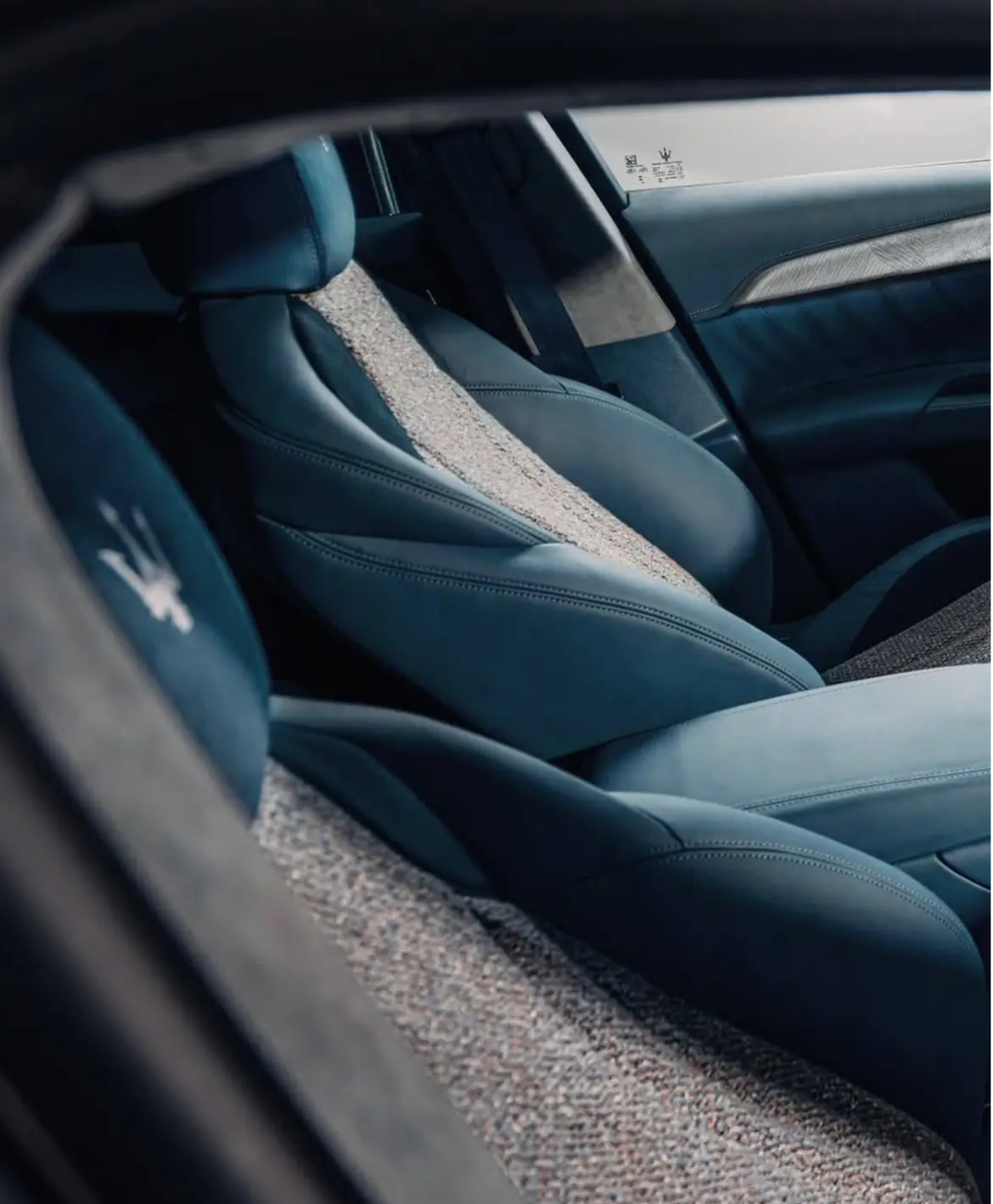 Le tour des sièges est en cuir bleu denim, les appuie tête en alcantara denim et le trident est en bois gravé, ce qui est unique dans la production mondiale.