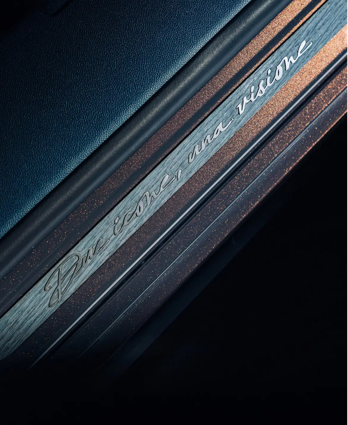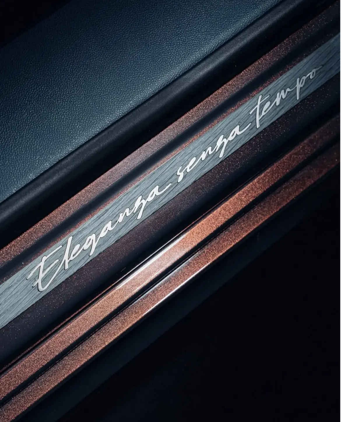 Les seuils de porte sont gravés au laser avec l’inscription « deux icônes, une vision ». Il semble que l’autre seuil de porte avant ait reçu l’inscription « Elégance intemporelle » (Eleganza senza tempo), mais je n’en ai pas trouvé de photo.