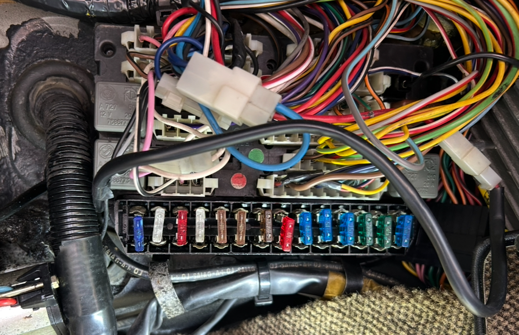 Les fusibles sont déjà plus modernes qu’à l’origine. Fred m’avait installé des fusibles modernes entre les barrettes originelles ce qui avait amélioré les choses. Avant, je mettais le contact et je me courbais pour appuyer sur la barrette et il fallait dans cette position tête en bas attendre 2 minutes qu’elle chauffe un peu (la tablette, pas la tête) sans quoi, je ne démarrais pas !