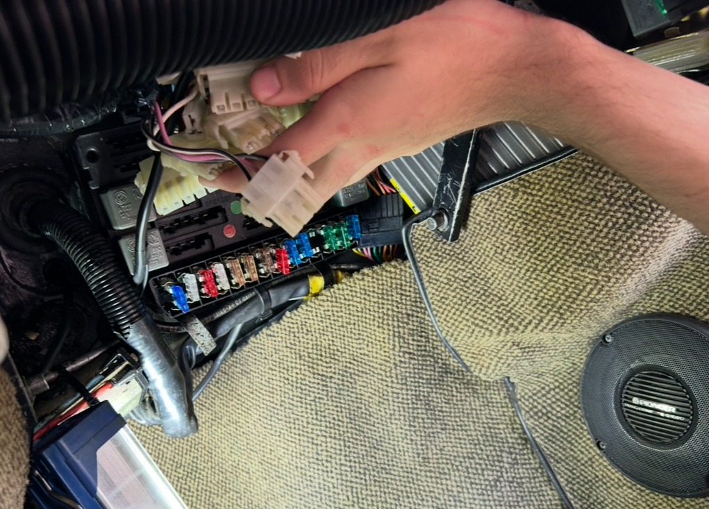 Côté habitacle, on débranche toutes les fiches sans les repérer, comme coté moteur, et on peut extraire la boîte à fusible par l’habitacle. Ci-dessous la boîte est extraite , on est dans l’habitacle et on voit les fiches côté moteur qui apparaissent plus sombres que les blanches de l’habitacle :