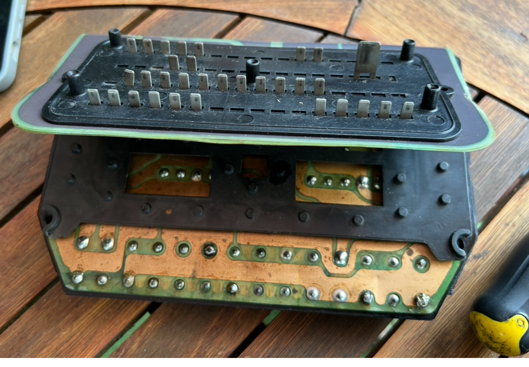 À l’intérieur du boîtier on découvre la carte circuits imprimés en « porte feuille » , comme on faisait à l’époque. Souvent ça craquait à la pliure mais celle ci n’est pas trop mal malgré une drôle de couleur à gauche :