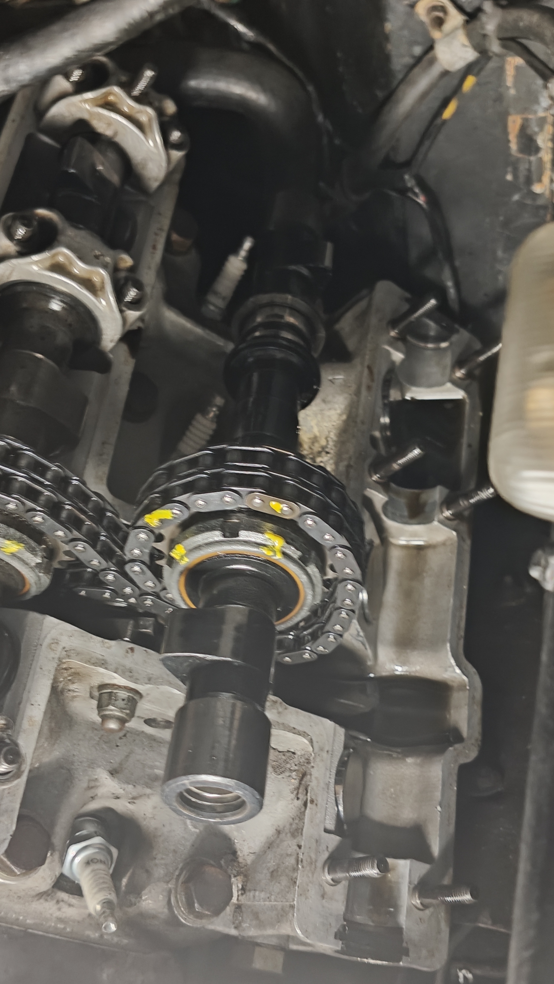 Ensuite c'est simple, vous remettez les pastilles sur les queues de soupapes, les poussoirs par dessus, positionnez les AAC (d'abord celui coté admission, si vous faites dans l'autre sens, il n'y a plus assez de jeu pour mettre le deuxième en place), serrez au couple les écrous des aac (15nm il me semble, mais vérifiez) et retendez la chaine (il y a au centre un trou dans lequel on peut mettre une clef allen qui va relever les patins, et tout en gardant cette clef sous tension, il faut resserer les deux écrous qui maintiennent le patin en place)