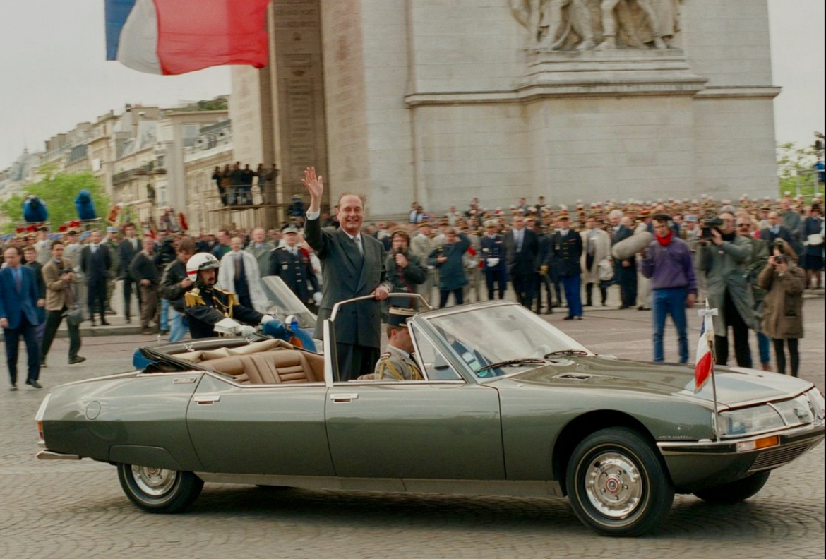 Une barre transversale aide (très peu) à la rigidité mais surtout au maintien des personnalités qui peuvent saluer la foule debout dans cette auto d’apparat. Ci-dessous Jacques Chirac en SM présidentielle passe devant l’Arc de Triomphe lors de son investiture en 1995 :