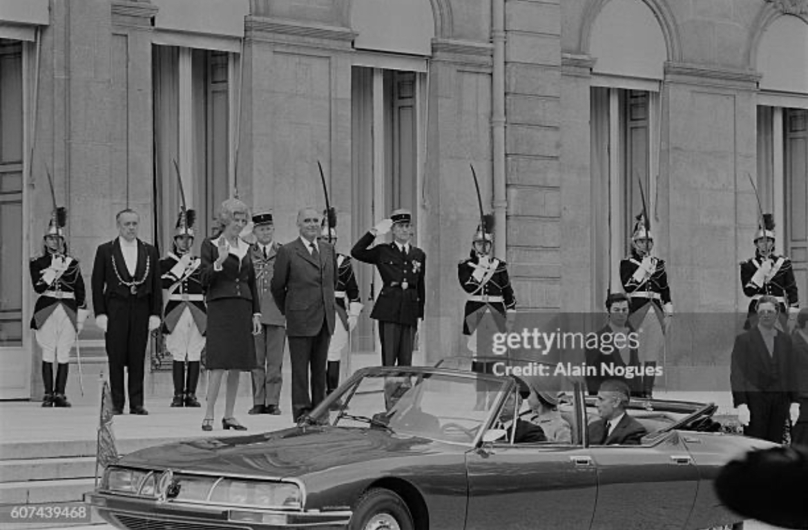 Le président Valery Giscard d’Estaing n’a pas utilisé la SM présidentielle (sans doute trop associée à son prédécesseur) lors de son investitude en 1974, préférant descendre les Champs Elysées à pied. Mais il s’en est servi lors de son mandat pour des occasions officielles. Ci-dessous lors de la visite de la reine du Danemark en 1978 :