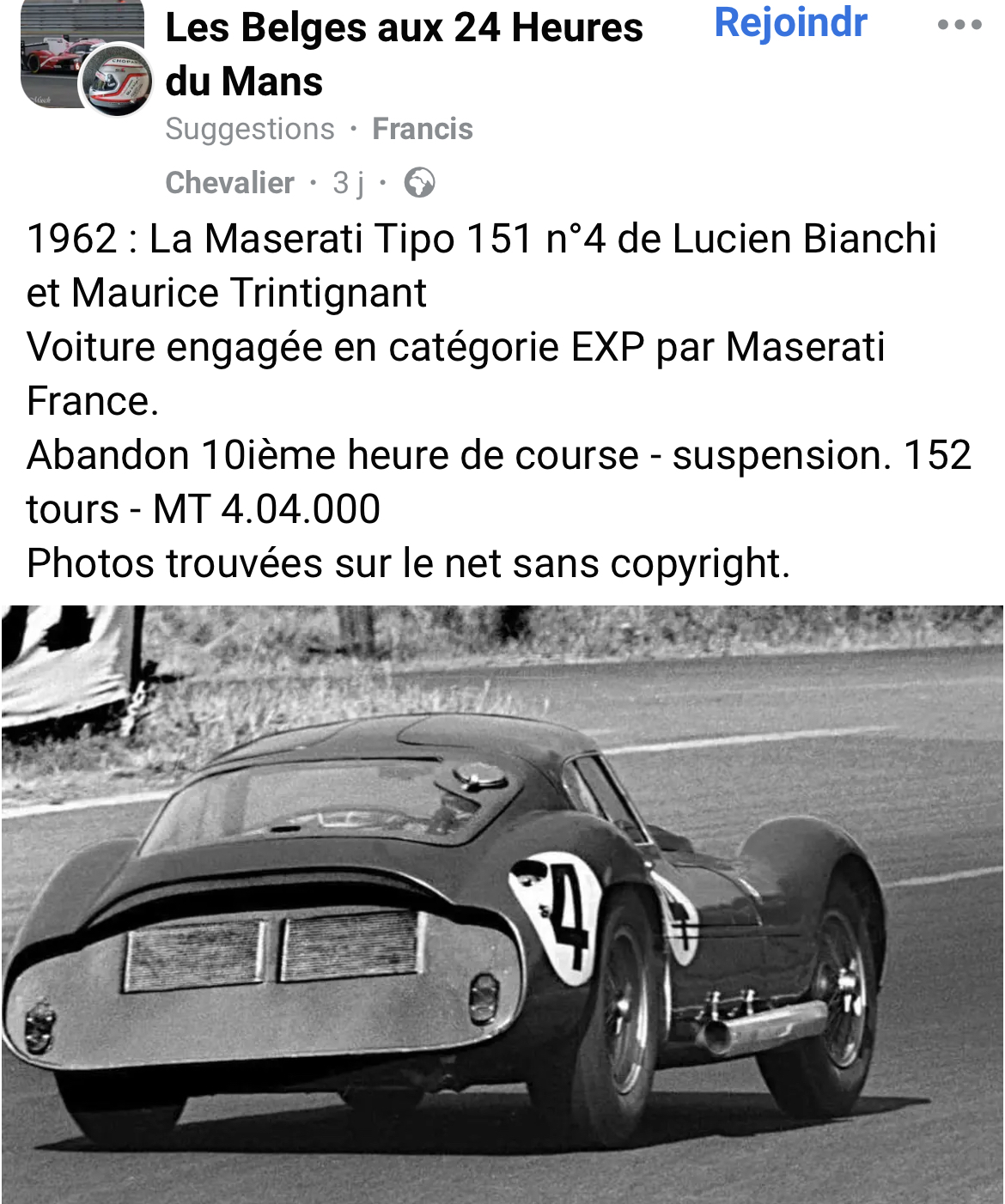 Sur la photo ci-dessous, prise lors des essais d'une Tipo 151 "Cunningham" à l'autodromo di Modena, on reconnait de la gauche à la droite Briggs Cunningham (point rouge), l'ingénieur Giampaolo Dallara qui était alors l'assistant de Giulio Alfieri (point bleu), Albert Momo le mythique chef mécanicien du team Cunningham (point jaune), John Simone (point vert), l'ingénieur Giulio Alfieri (point marron), Omer Orsi le directeur de Maserati (point mauve) :