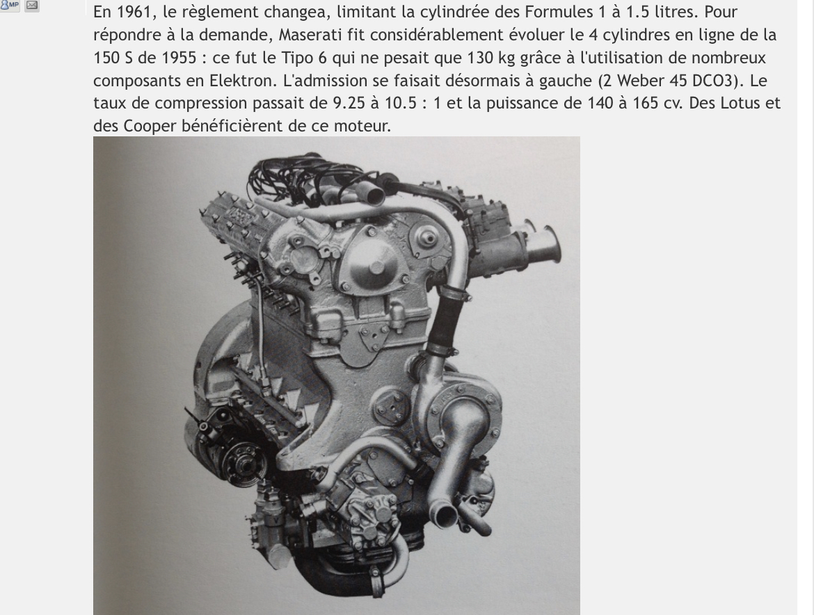 Mais ce Tipo 6 a surtout été utilisé en Formule 1, je pense qu'il était trop petit pour la Barquette Monaco qui a plutôt du recevoir le moteur Maserati 250S qui ressemble plus aux Coventry Climax qui étaient semble-t-il des 2.2 litres et 2.7 litres.