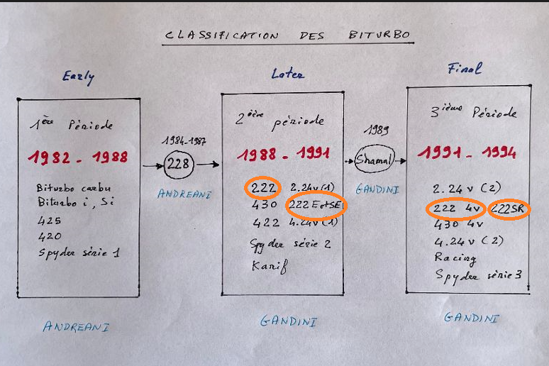 Le moteur 2.8 litres Biturbo à 3 soupapes par cylindre inauguré sur la 228 fut placé dès 1988 dans la caisse 222 avec l'appelation 222 E (pour Exportation). En 1990 apparut la 222 SE qui était une 222 E avec des pare-chocs plus enveloppant, carénant l'échappement à l'arrière. Née en 1991, la 222 SR (Super Racing) est une 222 SE avec des éléments de "Shamalisation" : spoiler au bas du parebrise, phares carénés (cat's eyes), calandre avancée. L'ultime Biturbo à carrosserie Andreani est la 222 4v (4 valvole, 4 soupapes par cylindre) qui fut présentée en 1991 (soit 10 ans après la Biturbo initiale) avec le moteur 2.8 litres à 4 arbres à cames en tête et 4 soupapes par cylindre.