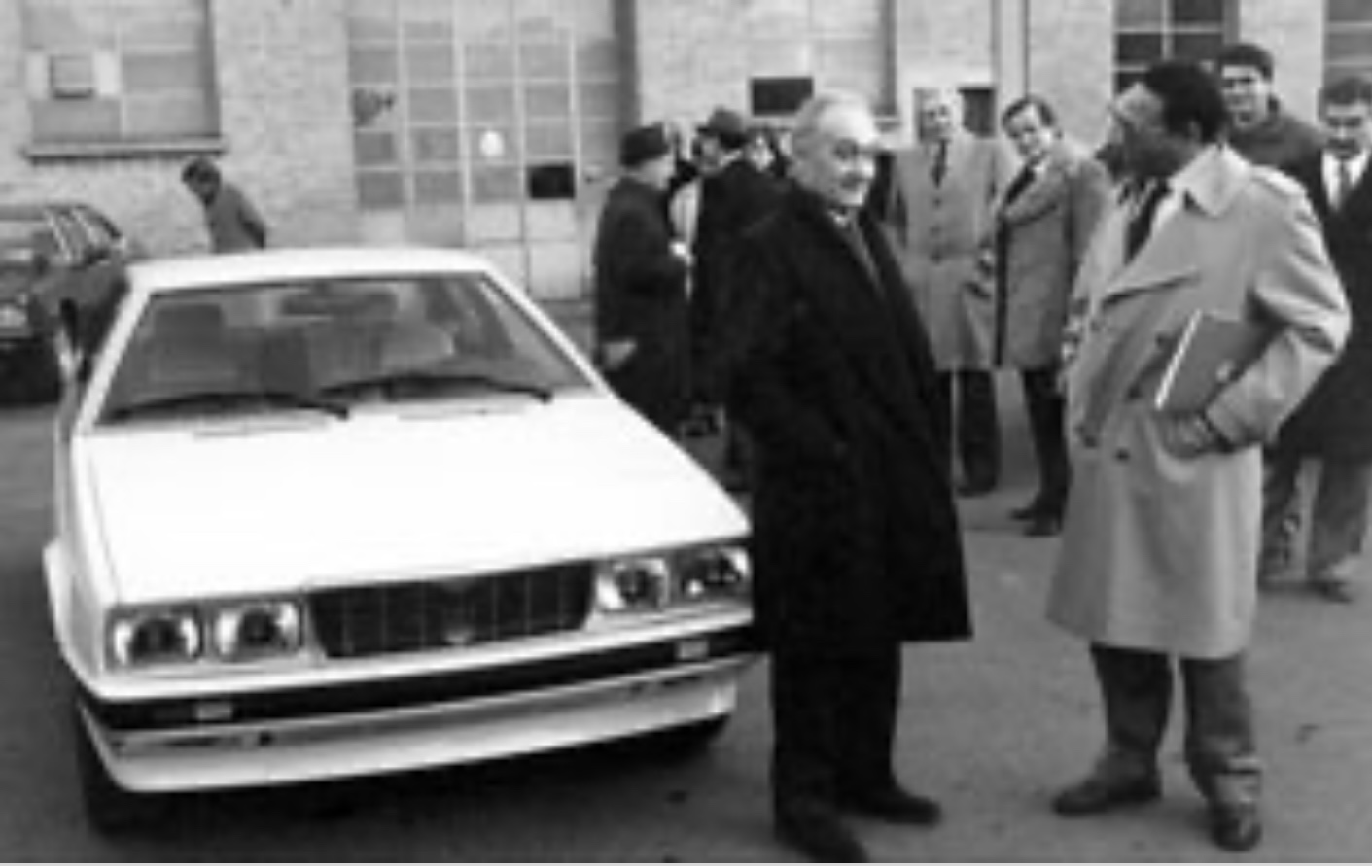 On a l’habitude de voir l’avant de la Biturbo blanche de présentation du 14 décembre 1981. Enfin voici l’arrière avec son double échappement chromé. Notez l’absence de rétroviseur droit, non obligatoire à l’époque :