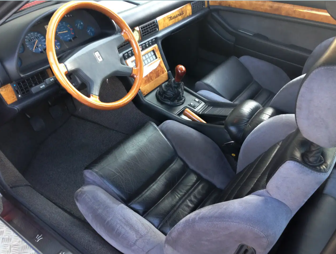 C’est l’intérieur standard des Biturbo 2.8 litres de cette génération, également commun à la 2.24v, avec l’alcantara sur les côtés et le cuir au milieu. Seules les 222 de 2 litres avaient un tout velours spécifique.